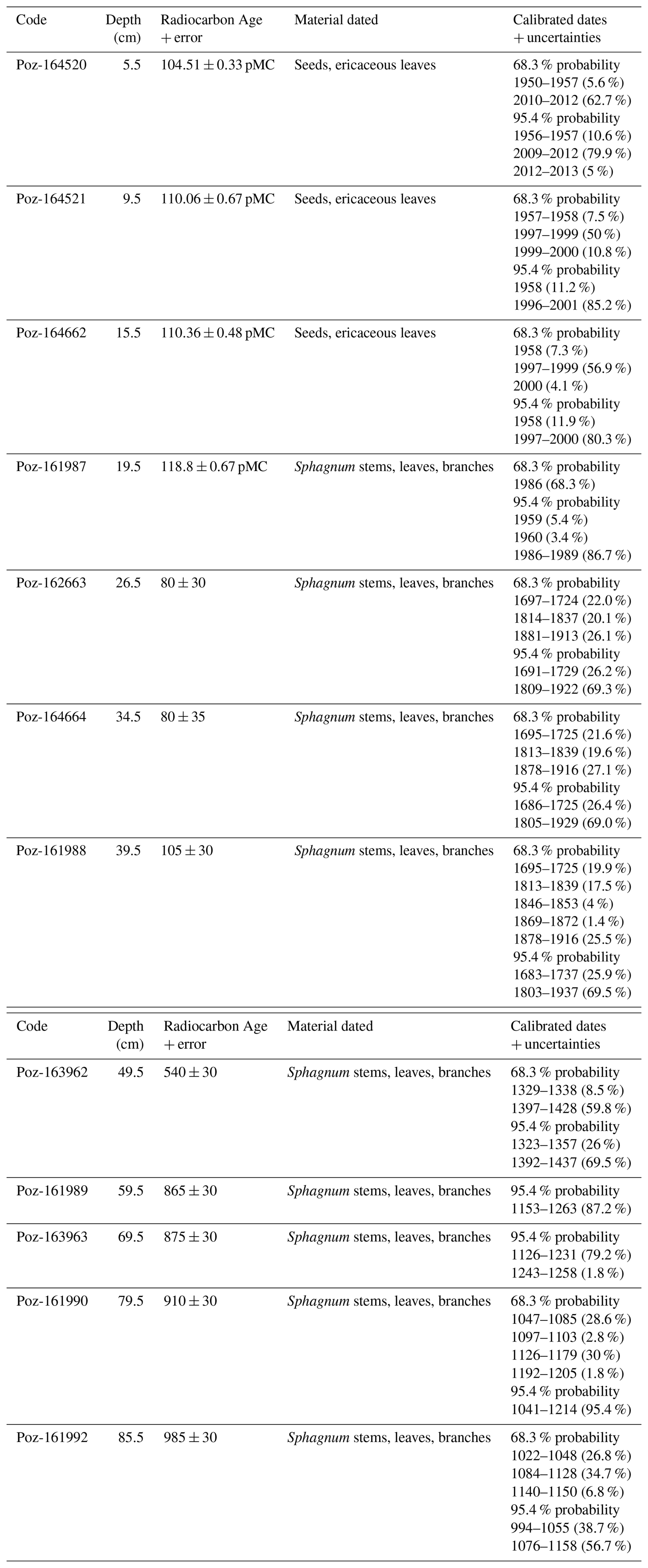 To provide a reliable chronology for recently accumulated peat, 210Pb and 239+240Pu analyses were used on material from the upper 40 cm of the core at 1 cm contiguous resolution, following methods outlined by Appleby (1998). Peaks in the activity of 239+240Pu, which are linked to nuclear fallout events (e.g., 1950s atmospheric nuclear tests), were also measured as independent time-markers to validate and supplement the age-depth model (Mróz et al., 2017; Cwanek et al., 2021). Samples were processed at the Polish Academy of Sciences' Institute of Nuclear Physics, Kraków, Poland using an AlphaAnalyst™ 7200 spectrometer (Mirion Technologies). Quality control and accuracy was ensured by measuring blanks and certified reference material (IAEA 447, IAEA 385) alongside the core samples (results are provided in Table S1. The activity concentration of 210Pb ( years) was estimated by measurement of its decay product – 210Po ( d), while 239+240Pu was measured directly. Activity concentrations of 210Pb and 239+240Pu are reported in units of Bq kg−1.