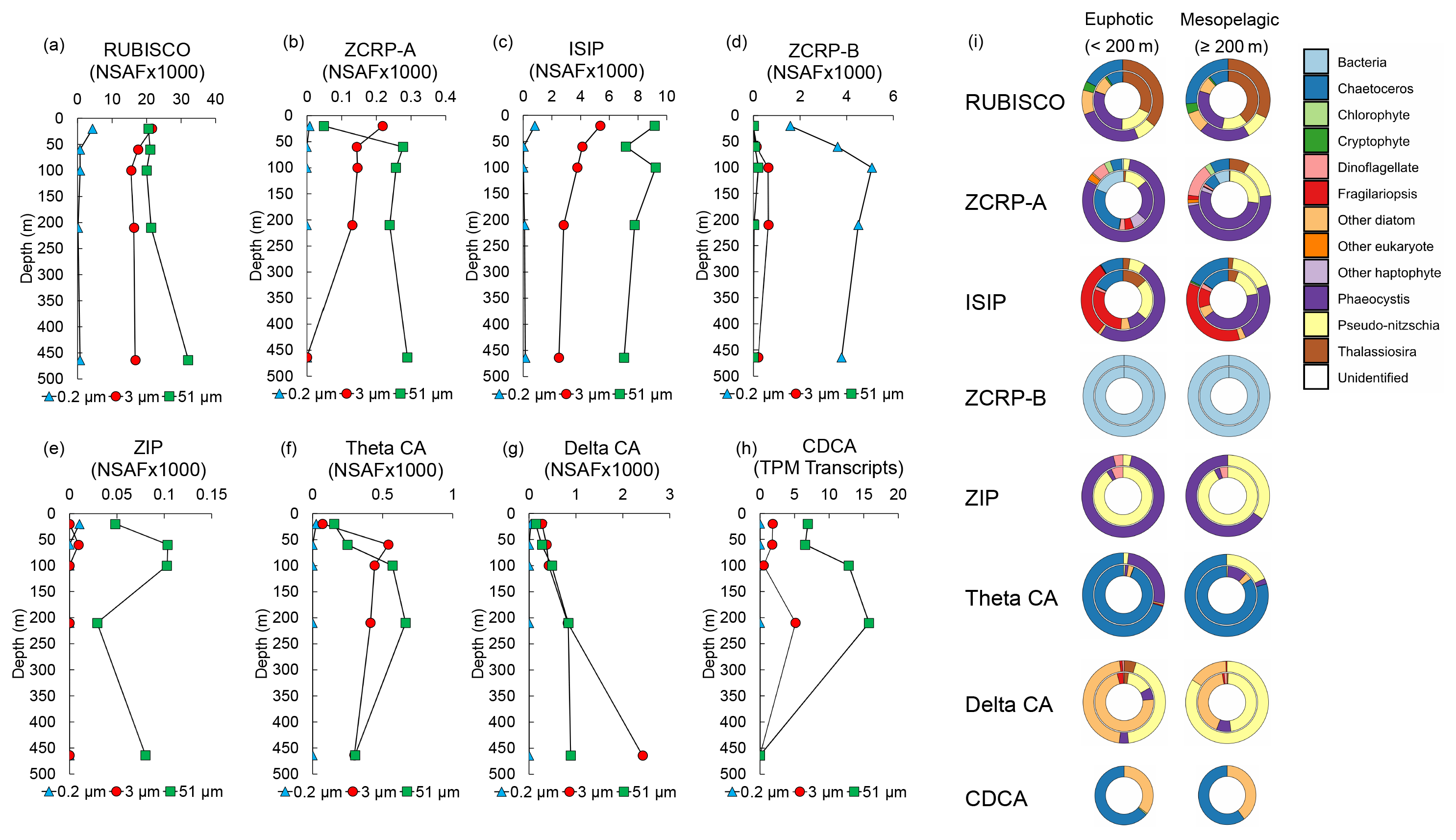 Figure 3Metatranscriptomic and metaproteomic detection of Zn- and Fe-related proteins of interest at the experimental site. Depth profiles of summed NSAF-normalized protein spectral counts of (a) RUBISCO, (b) ZCRP-A, (c) iron-starvation-induced proteins (ISIPs), (d) ZCRP-B, (e) ZIP, (f) theta CA, and (g) delta CA detected from proteomic analysis of each filter size fraction (0.2, 3, and 51 µm). (h) TPM-normalized transcript read counts of CDCA. (i) Stacked pie charts depicting relative community composition for proteins of interest for euphotic (< 200 m) and mesopelagic (≥ 200 m) depths. The outer rings show community composition based on NSAF-normalized protein spectral counts, while the inner rings are TPM-normalized transcript read counts. Protein and transcript counts plotted in (i) were summed across all size fractions. ISIPs are the combined spectral counts of ISIP1A, ISIP2A, and ISIP3.