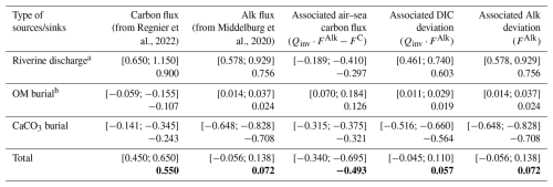 Table 3Literature-based estimates of riverine/burial fluxes of carbon and Alk, from the most recent carbon and Alk budgets (Sect. 4.1.1 and 4.2.1, and see Fig. E3), including the calculation of the corresponding air–sea carbon flux, as well as carbon and Alk content deviations. The values are presented in petagrams of carbon per year. Values in brackets represent the uncertainty or extreme range, while the bold value indicates the best estimate or average. The intervals are arranged with the smallest absolute value first, except when both positive and negative values are present in the range.
