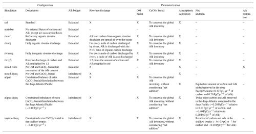 First, we introduced variations in riverine discharge to account for uncertainties in its magnitude and partly unresolved characteristics (e.g. labile/refractory, organic/inorganic partitioning). By closing the Alk budget, these variations influenced CaCO3 burial. In “rivref”, the OM riverine discharge was considered fully refractory (i.e. persisting on a timescale longer than that of ocean circulation), in contrast to the labile assumption in the standard simulation. We explored fully organic and inorganic riverine discharges in “rivorg” and “rivinorg”, respectively, and also increased riverine discharge by a factor of 1.5 in “riv1p5”, while maintaining the same partitioning as std. Second, to assess the effect of a non-conserved Alk inventory or an Alk restoration scheme, we disabled OM and CaCO3 burial, artificially restoring Alk in “nobur-resto” or assuming a non-conserved Alk inventory in “nobur-diseq”. Third, we varied CaCO3 burial to address uncertainties in its pre-industrial magnitude and spatial distribution. We added CaCO3 burial/dissolution between the Atlantic and Pacific, balancing the Alk budget in “atlpac”, or not in “atlpac-diseq”, and we also added CaCO3 burial in the tropics, resulting in an imbalanced Alk budget in “tropics-diseq”.