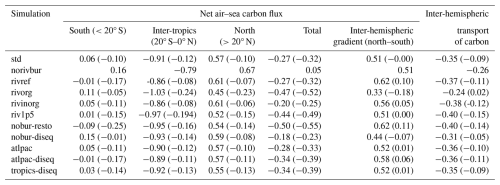 Finally, by taking the difference between our standard simulation and the simulation without riverine and burial fluxes (std minus norivbur), we isolate the component of interest, i.e. that induced by riverine and burial fluxes (Sect. 2.2.2). This riverine/burial-driven air–sea carbon flux results in a net global outgassing of 0.31 PgC yr−1, distributed among the northern, inter-tropical, and southern regions as follows: 0.10, 0.12, and 0.10 PgC yr−1 (Fig. 4c).