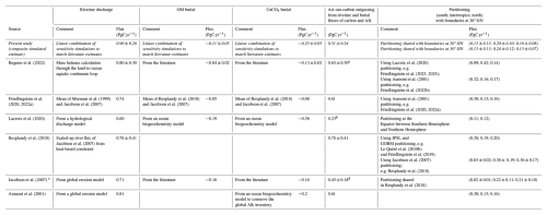 Table E2Literature review of the riverine/burial-driven air–sea carbon flux estimates, sharing also values and a description of the riverine discharge, OM burial, and CaCO3 burial. The values obtained from the composite simulated estimate are also shared in italics. Note that its riverine discharge, OM burial and CaCO3 fluxes (see Table 3) differ from those considered in the GCB and derived from Regnier et al. (2022), as we also account for flux on continental shelves.
