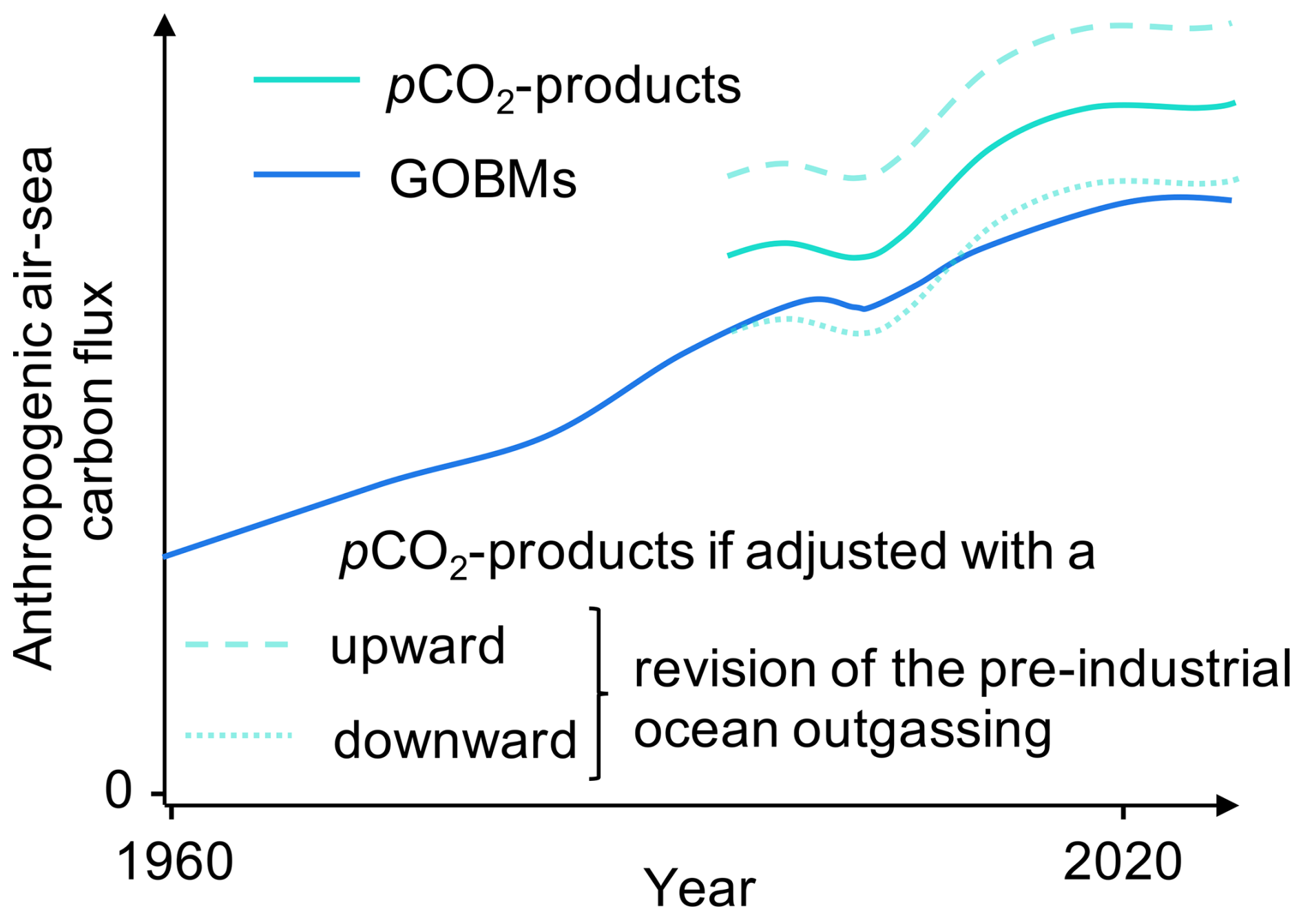 Figure 1Schematic illustration of how a bias in evaluating the pre-industrial ocean carbon outgassing affects the assessment of the anthropogenic carbon flux based on pCO2-products. A downward revision of the pre-industrial outgassing would decrease anthropogenic carbon flux estimates based on pCO2-products, while an upward revision would increase it. This effect applies both globally and regionally.