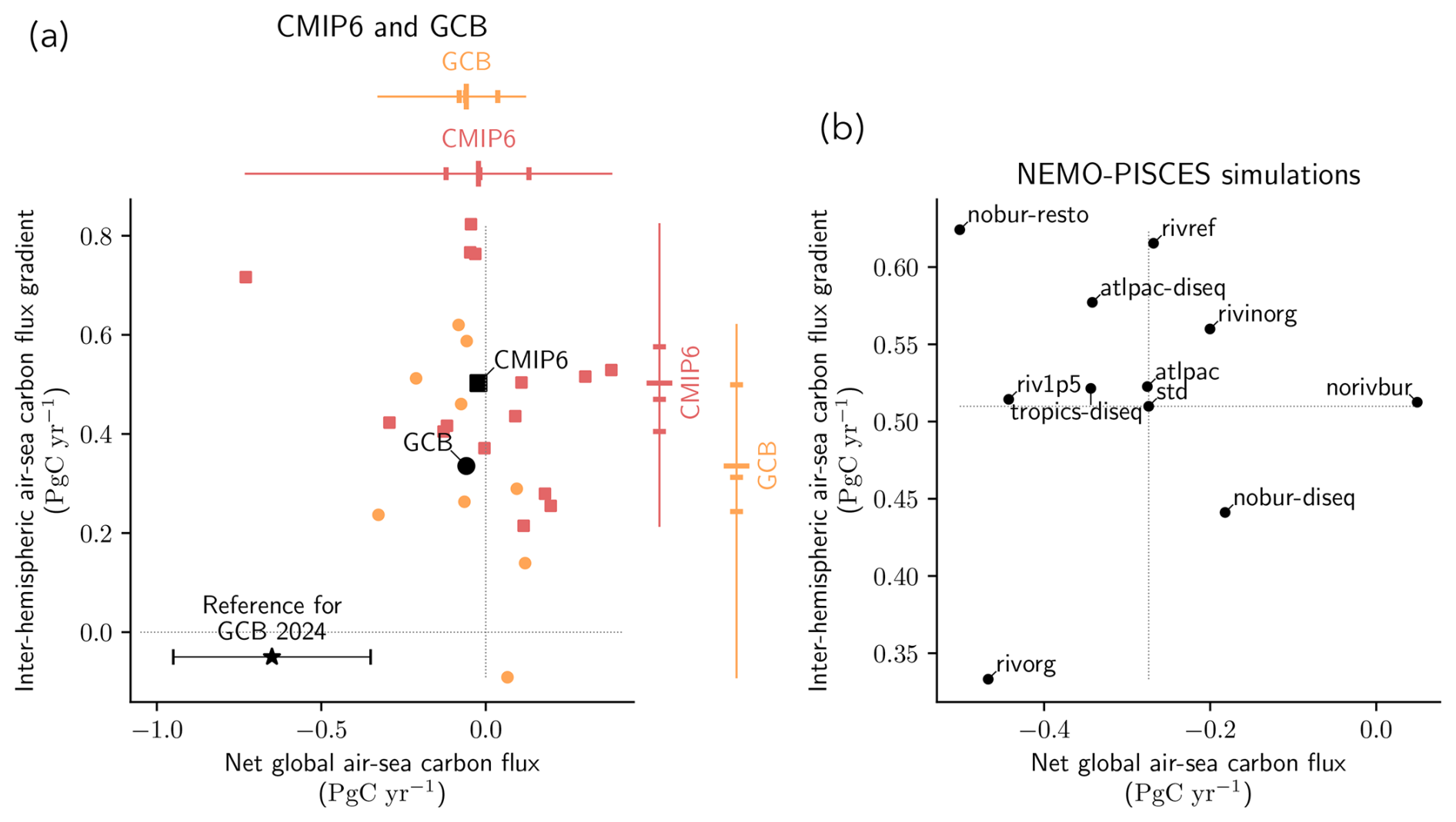 Figure 2Pre-industrial air–sea carbon flux from models. The globally integrated pre-industrial flux (x axis) and its inter-hemispheric gradient (y axis) are indicated for (a) CMIP6 Earth system models (ESMs) and GCB Global Ocean Biogeochemical Models (GOBMs), as well as for (b) the NEMO-PISCES sensitivity simulations. (a) The 15 CMIP6 ESMs (10 GCB GOBMs; see Appendix B1) are plotted with red squares (orange circles). The black square and circle refer to the CMIP6 and GCB ensemble means. The CMIP6 and GCB ensemble ranges (line), mean (major tick), and quartiles (minor ticks) are respectively displayed to the top and right in red and orange. The star refers to the reference value used in the GCB 2024 (Table 1; Friedlingstein et al., 2025). The inter-hemispheric air–sea carbon flux gradient is defined as the difference between its values in the Northern Hemisphere and Southern Hemisphere (Sect. 2.1.4).