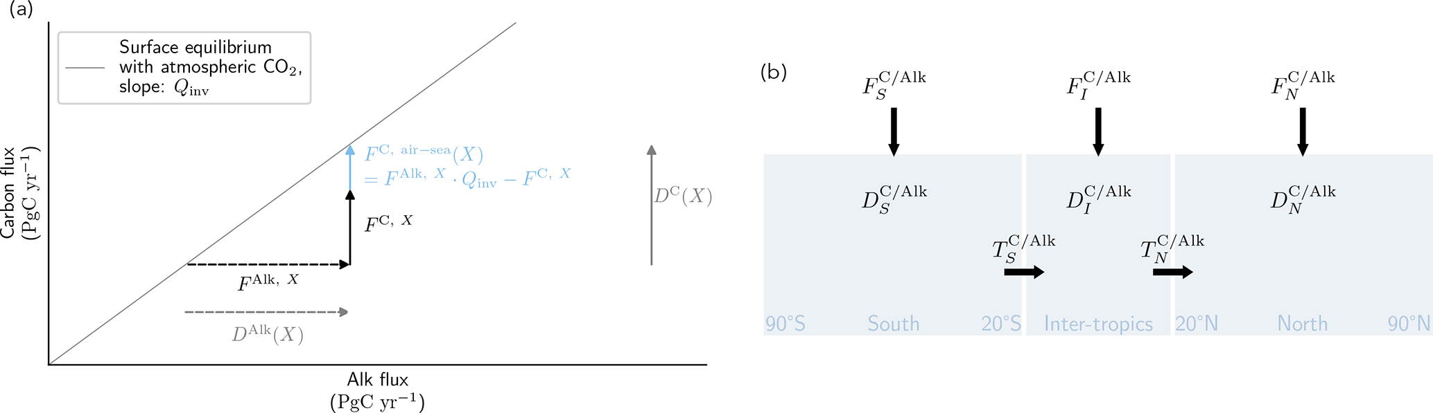 Figure 3Schematics of the theoretical framework introduced in this paper. (a) Conceptual representation of a process X (e.g. CaCO3 burial), which affects carbon (FC, X) and Alk (FAlk, X), thereby induces, at steady state, a compensating carbon flux (FC, air–sea(X)) and the resulting deviations in carbon and Alk inventories (). The equilibrium of the Alk:DIC pair with atmospheric CO2 is represented by a solid grey line. Carbon (Alk) fluxes are represented through solid (dashed) arrows. (b) Schematic diagram of carbon and Alk budgets by ocean region. and respectively refer to the total external fluxes (directed into the ocean) and to the northward transport of carbon and Alk. corresponds to the regional carbon and Alk inventory deviations in each basin. S, I, and N refer to the different ocean regions, i.e. the Southern Hemisphere, the inter-tropical zone, and the Northern Hemisphere.