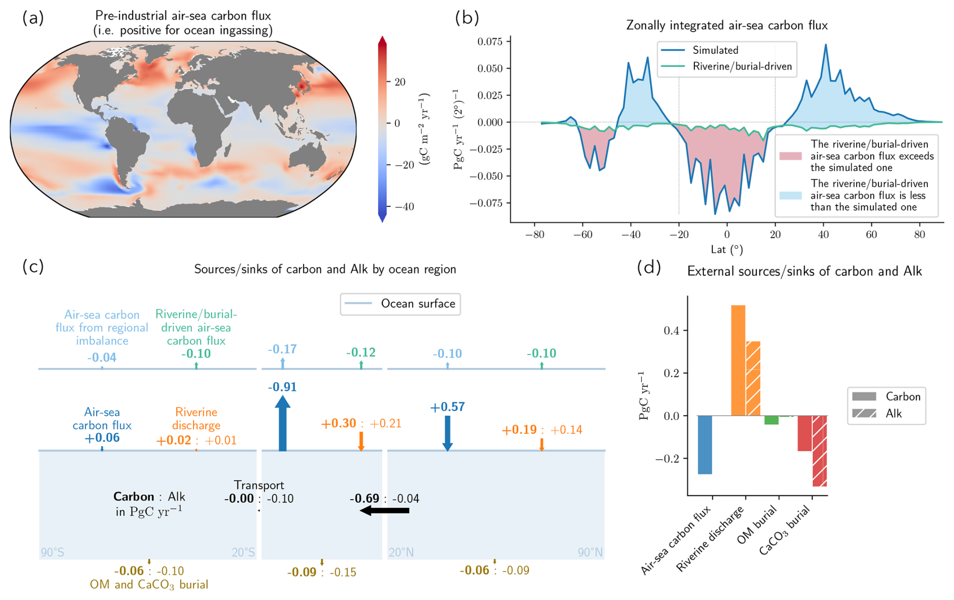 The net air–sea carbon flux derived from pCO2-based data encompasses both anthropogenic and natural components. The natural component originates, at the global scale, from the balance between riverine discharge and the burial of organic matter (OM) and calcium carbonate (CaCO3). As these external fluxes together represent a net source of carbon for the ocean, they result in a net carbon outgassing at steady state during the pre-industrial era. Consequently, assessing the anthropogenic carbon flux through observations requires determining the pre-industrial riverine/burial-driven air–sea carbon flux and its spatial distribution (e.g. Hauck et al., 2020; Friedlingstein et al., 2025).