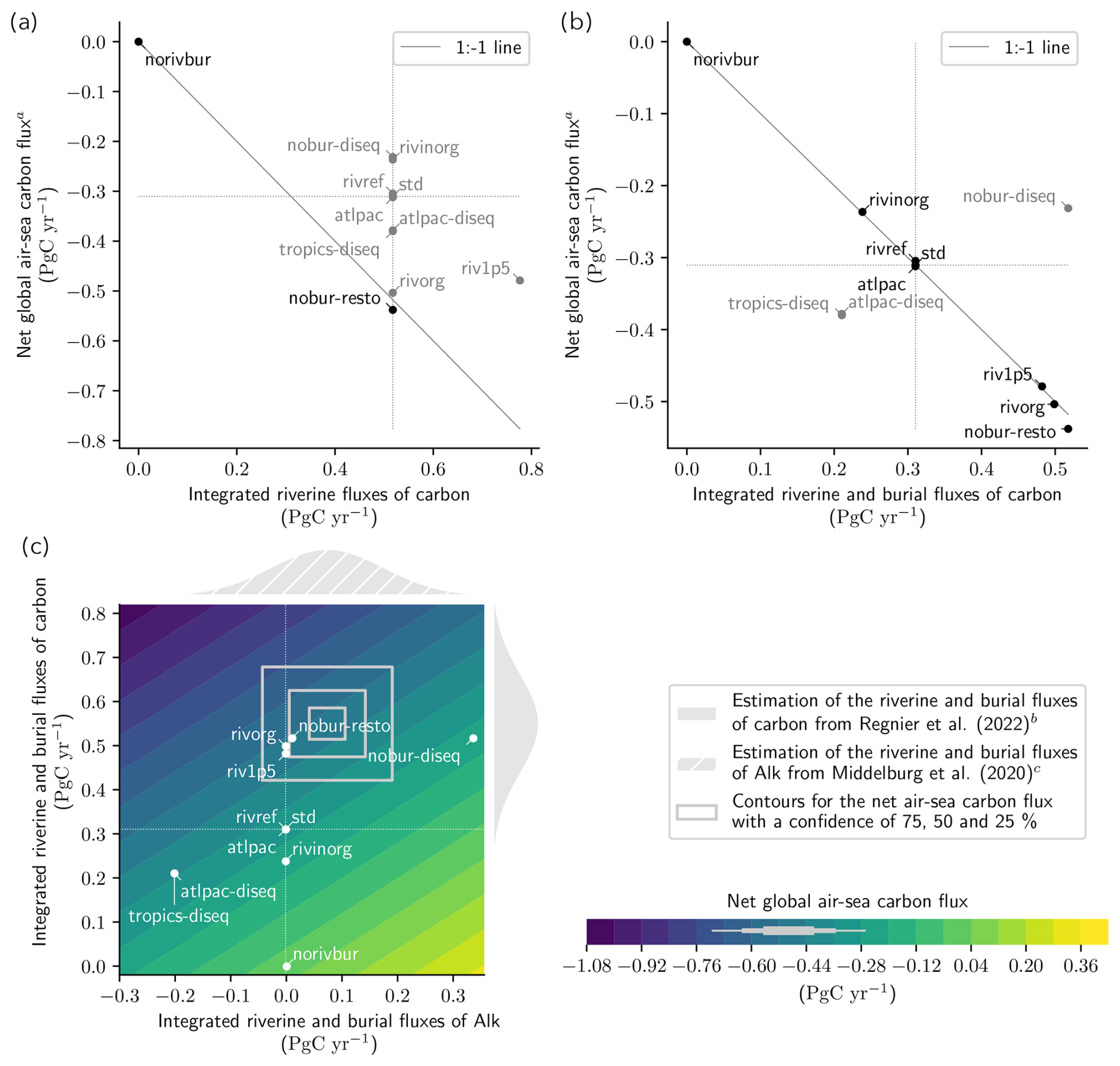 Figure 5The role of riverine and burial fluxes of carbon and Alk in determining the pre-industrial air–sea carbon flux. (a, b) Comparison between the net global air–sea carbon fluxa and (a) the integrated riverine fluxes of carbon or (b) the integrated riverine and burial fluxes of carbon. When the net air–sea carbon flux balances the considered external fluxes (on the 1:1 line), simulation names are indicated in black. This applies to (a) simulations that do not account for burial and conserve the global Alk inventory (norivbur and nobur-resto) and (b) all simulations conserving the global Alk inventory (excluding nobur-diseq, atlpac-diseq, and tropics-diseq). (c) Theoretical framework that accounts for Alk and carbon budgets to reconstruct the net air–sea carbon flux. The net air–sea carbon flux (filled contours) is determined by multiplying the integrated riverine and burial fluxes of Alk (x axis) by Qinv and then subtracting the integrated riverine and burial fluxes of carbon (y axis). The deviation of the net air–sea carbon flux from this relationship in the NEMO-PISCES sensitivity simulations is small (less than 0.01 PgC yr−1 for all, except nobur-resto: less than 0.03 PgC yr−1). Simulations with a conserved global Alk inventory align with the zero x-axis line. The most recent carbon and Alk budgets (Table 3) provide estimates of riverine and burial fluxes of carbonb and Alkc, as shown at the top and on the right in grey. The net air–sea carbon flux reconstructed from these flux estimates is indicated as grey rectangles, with confidence intervals at 75 %, 50 %, and 25 %, and projected on the colour bar. a The net air–sea carbon flux of the NEMO-PISCES sensitivity simulations was adjusted for their respective residual carbon budget imbalances (see Appendix B2.4). b This distribution also includes fluxes from groundwater discharge. c This distribution also includes fluxes from anaerobic processes, groundwater discharge, and reverse weathering.