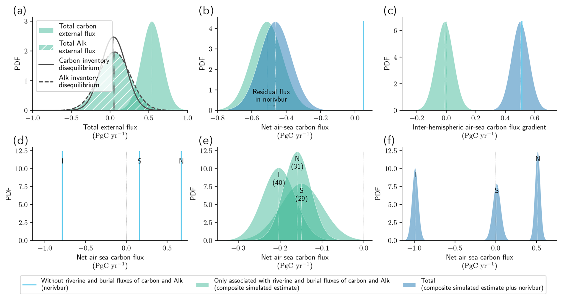 The air–sea carbon flux calculated by applying Eq. (10) to the riverine and burial fluxes of a specific region can only be considered a potential air–sea carbon flux, i.e. a capacity to generate such a flux at the global scale, without any guarantee that it fully occurs within the same region. Due to ocean circulation and the associated transport of carbon and Alk, regional carbon:Alk budget imbalances in riverine and burial fluxes explain the regional distribution of the drivers of the global air–sea carbon flux. However, they only partially explain the regional distribution of the flux itself.