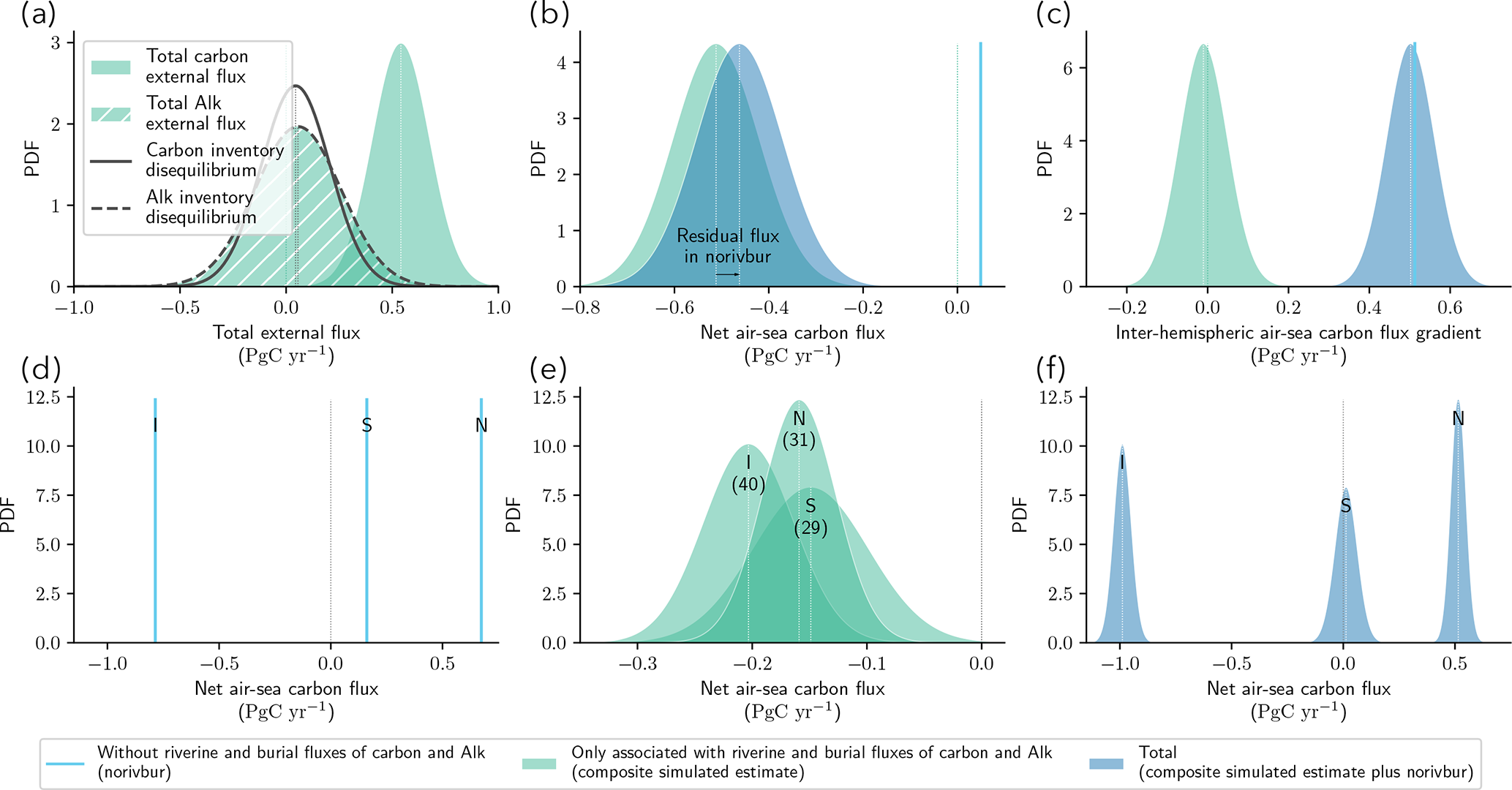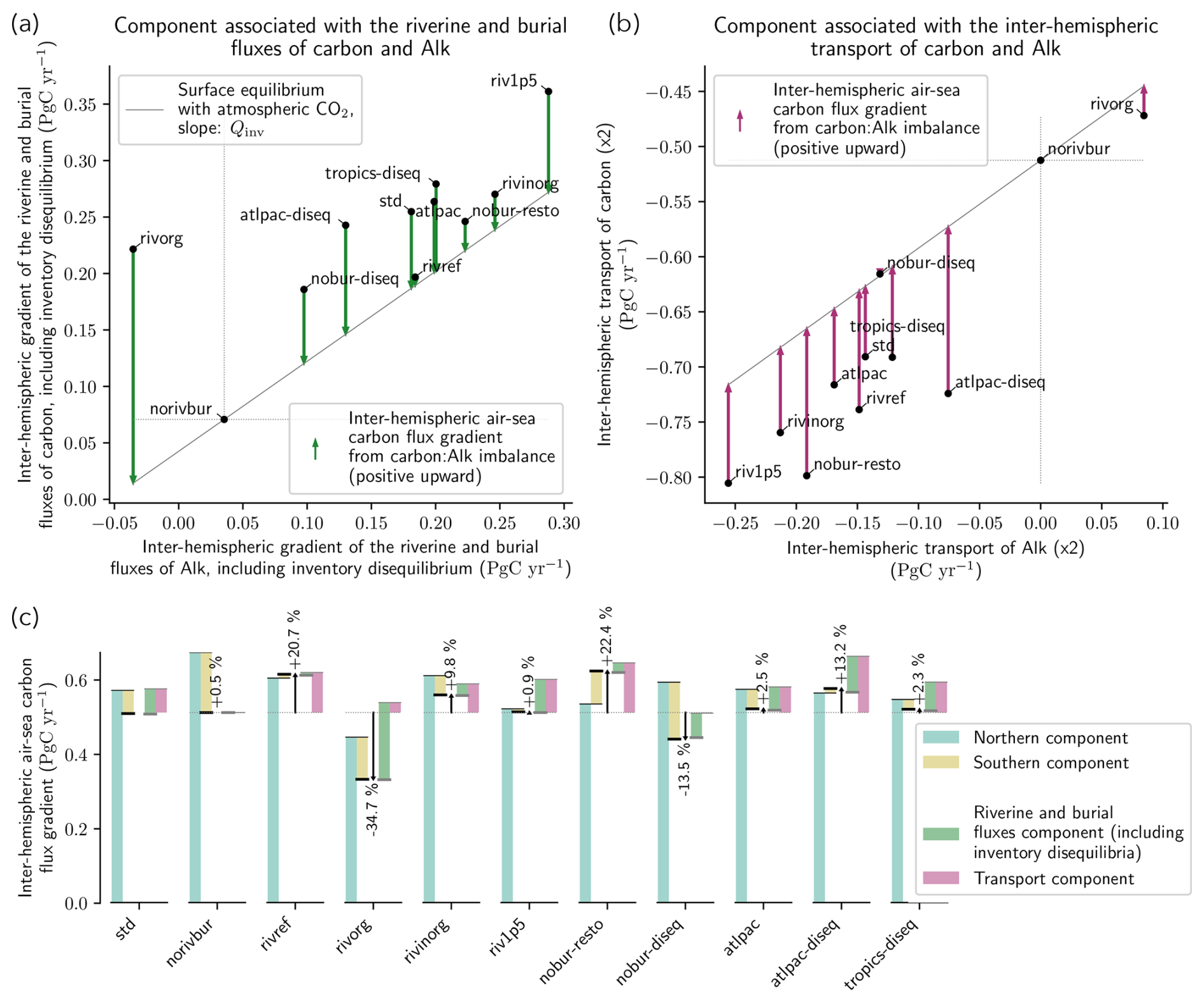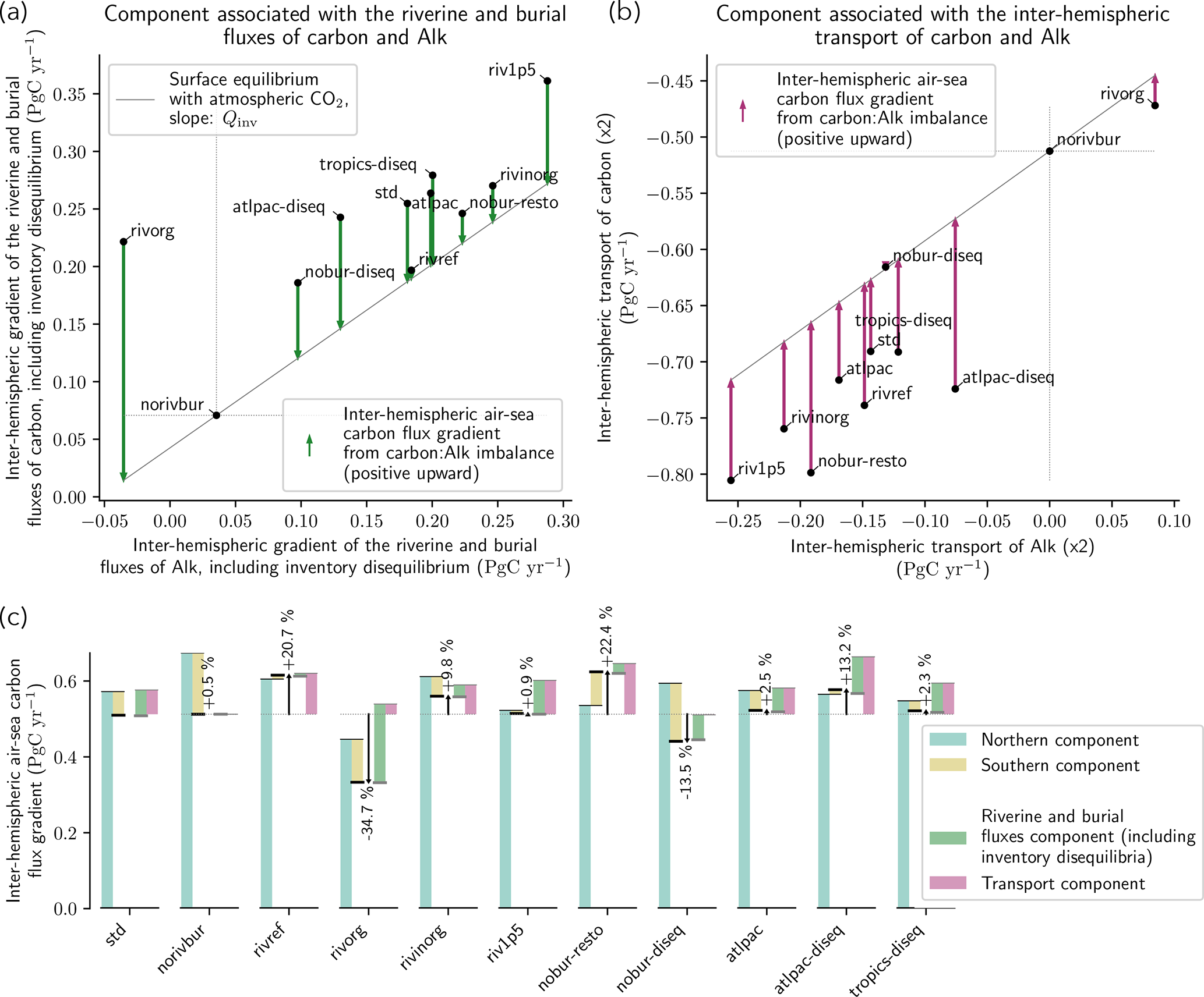 where “riv.” stands for “riverine discharge”, “bur. org.” for “OM burial”, and “bur. inorg.” for “CaCO3 burial”, and “minor components” encompass other minor external fluxes, such as carbon release by mid-ocean ridges and groundwater discharge. Thus, assuming a conserved pre-industrial global Alk inventory, the riverine/burial-driven air–sea carbon flux is the opposite of the riverine and burial fluxes of carbon: