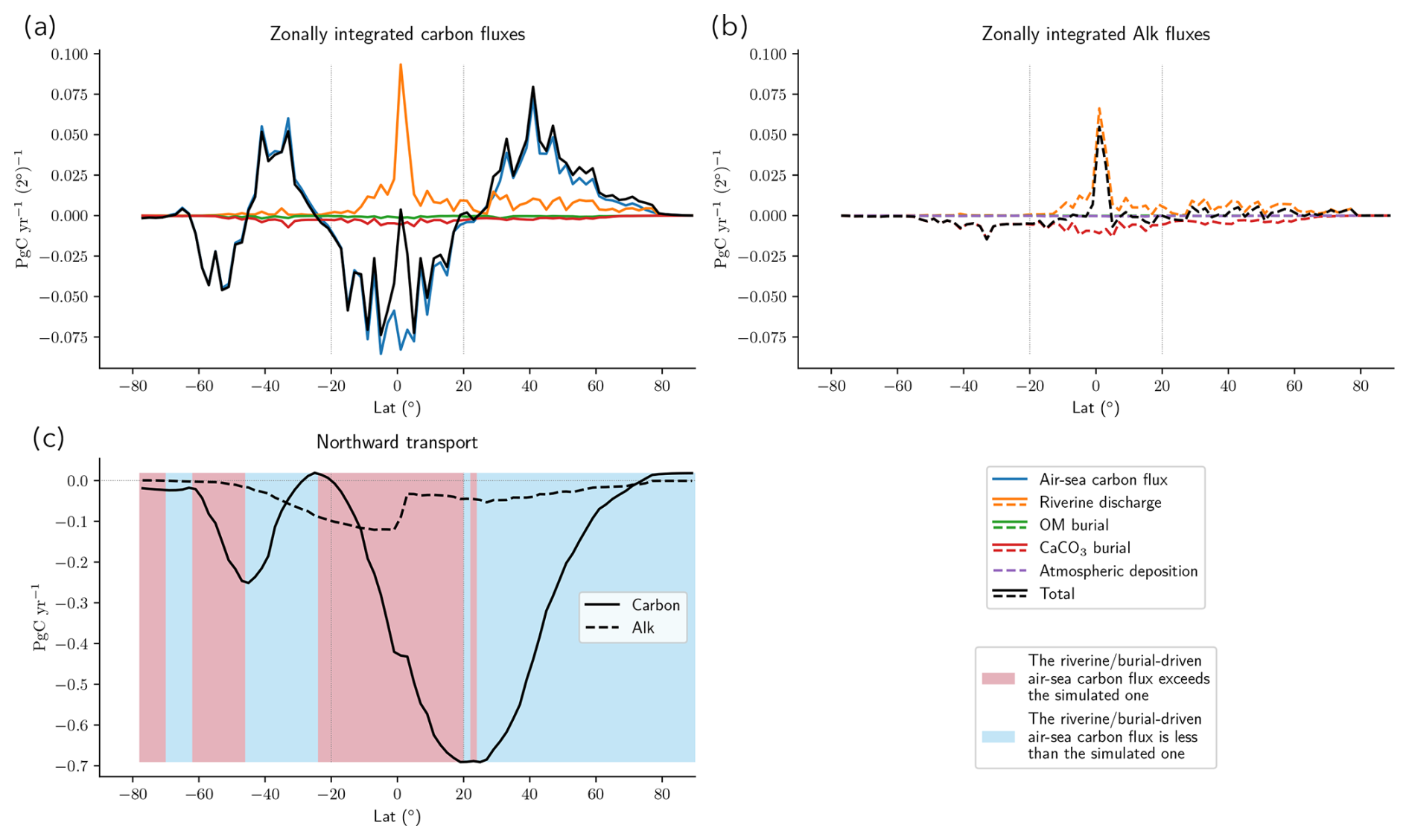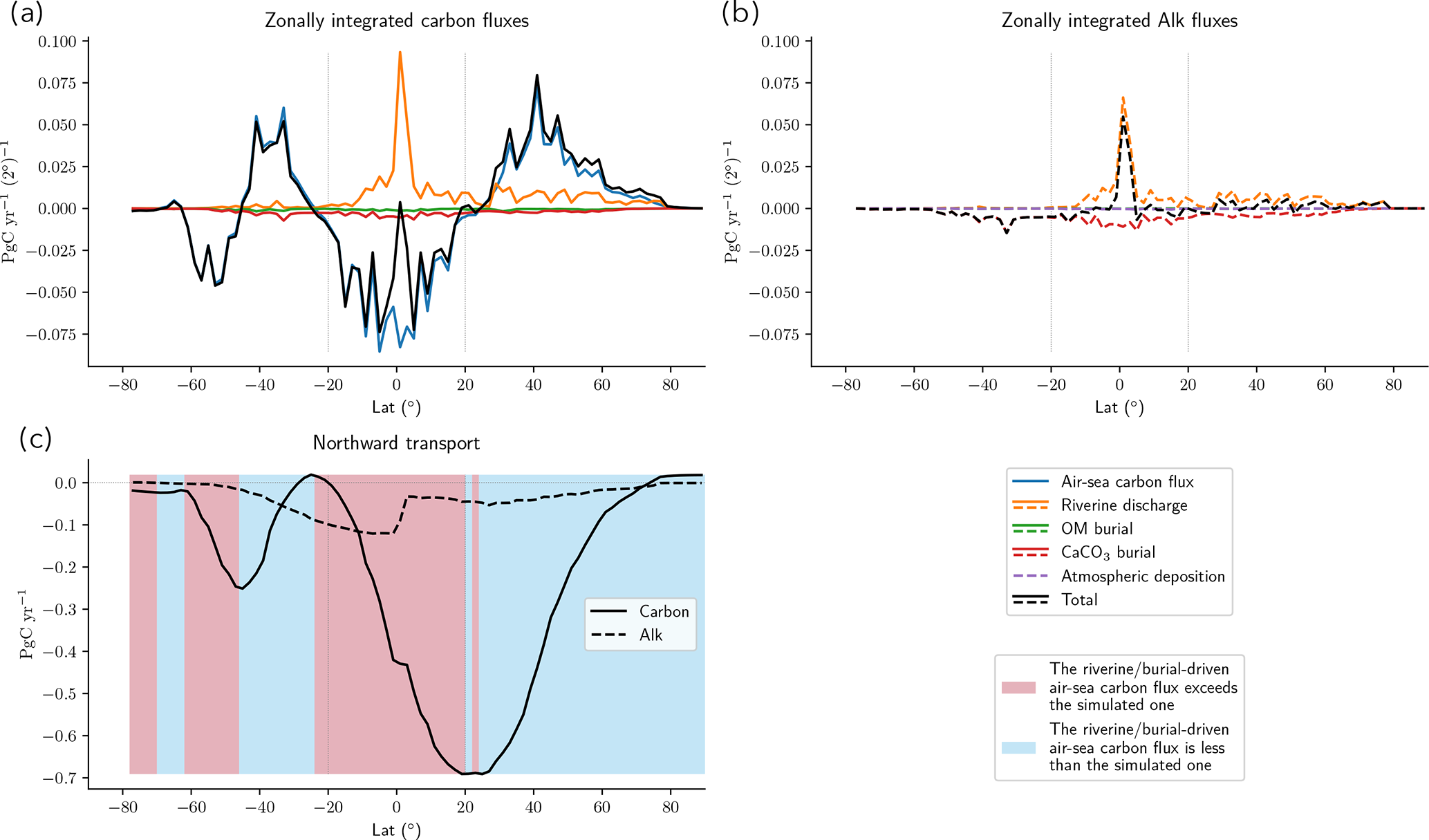 Finally, by taking the difference between our standard simulation and the simulation without riverine and burial fluxes (std minus norivbur), we isolate the component of interest, i.e. that induced by riverine and burial fluxes (Sect. 2.2.2). This riverine/burial-driven air–sea carbon flux results in a net global outgassing of 0.31 PgC yr−1, distributed among the northern, inter-tropical, and southern regions as follows: 0.10, 0.12, and 0.10 PgC yr−1 (Fig. 4c).