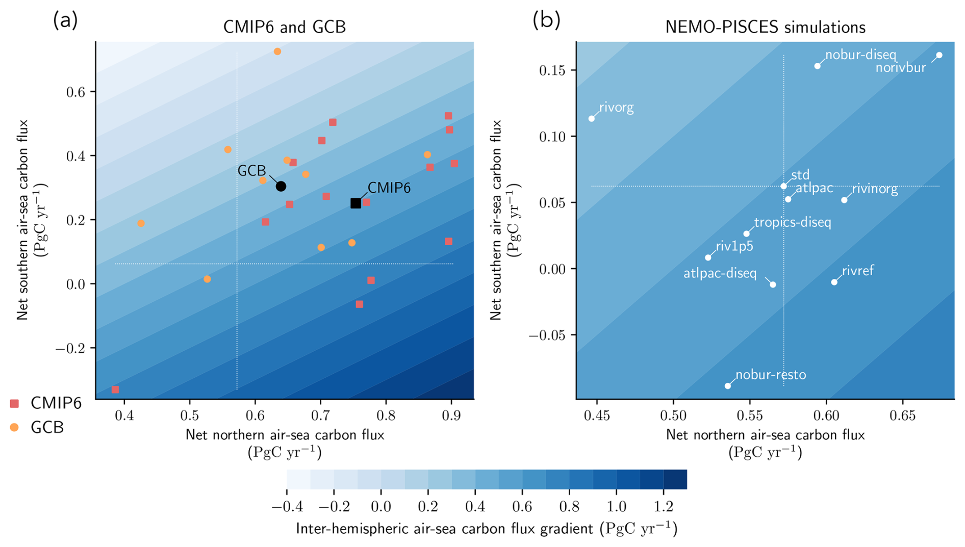 Enhancing our understanding of the riverine/burial-driven air–sea carbon flux is critical to achieving more precise estimates of the anthropogenic carbon flux and its distribution from data-driven assessments. Numerical models hold great promise in addressing this challenge, particularly for estimating the spatial distribution of the flux. However, at present, the representation of the pre-industrial air–sea carbon flux remains uncertain in inter-model comparison exercises like CMIP6 (the 6th phase of the Coupled Model Intercomparison Project, Eyring et al., 2016) and the 2024 GCB (Friedlingstein et al., 2025), likely due to differences in model setups and various/incomplete representations of sediment burial and riverine discharge (Terhaar et al., 2024). The magnitude of this global net flux ranges from −0.73 to 0.38 PgC yr−1, while its inter-hemispheric gradient, defined as the difference between its values in the Northern Hemisphere and Southern Hemisphere, ranges from −0.09 to 0.82 PgC yr−1 (Fig. 2a).