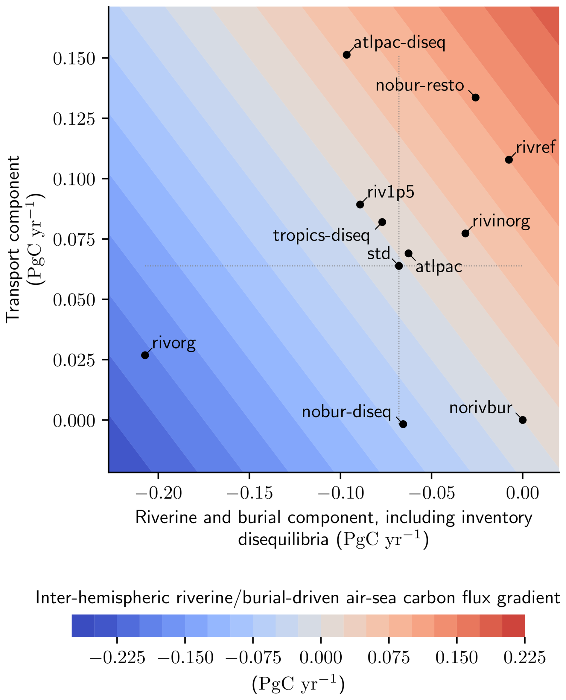 The decoupling between the magnitude of the net riverine/burial-driven air–sea carbon flux and its inter-hemispheric gradient is primarily linked to the distribution, both horizontally and vertically, of the carbon:Alk budget imbalance resulting from riverine and burial fluxes (Sect. 2.1.2). When an excess of CaCO3 burial is considered at the bottom of the Atlantic (primarily in the Northern Hemisphere; atlpac-diseq), the resulting impact of the carbon:Alk budget imbalance on the riverine/burial-driven air–sea carbon flux occurs remotely, in the Southern Hemisphere, due to the meridional overturning circulation. This results in a relative outgassing compared to std (−0.07 PgC yr−1) and an increase in the inter-hemispheric riverine/burial-driven air–sea carbon flux gradient (+0.07 PgC yr−1; see Fig. B4b). Conversely, when the surplus of CaCO3 burial is in the shallow tropics (tropics-diseq), the riverine/burial-driven air–sea carbon flux anomaly compared to std is equivalent to the one reported for atlpac-diseq, but the inter-hemispheric gradient is this time nearly not impacted relative to std (+0.01 PgC yr−1) since the flux anomaly is concentrated in the shallow tropics, primarily affecting the regional air–sea carbon flux. Similarly, flux anomalies resulting from carbon:Alk budget imbalances with respect to the riverine fluxes tend to manifest regionally (i.e. primarily in the Northern Hemisphere): (i) a fully organic riverine discharge (rivorg) leads to a relative outgassing compared to std (−0.19 PgC yr−1), aligned with a decrease in the inter-hemispheric gradient (−0.18 PgC yr−1), and (ii) a fully inorganic riverine discharge (rivinorg) leads to a relative ingassing compared to std (+0.07 PgC yr−1), aligned with an increase in the inter-hemispheric gradient (+0.05 PgC yr−1; see Fig. B4b).