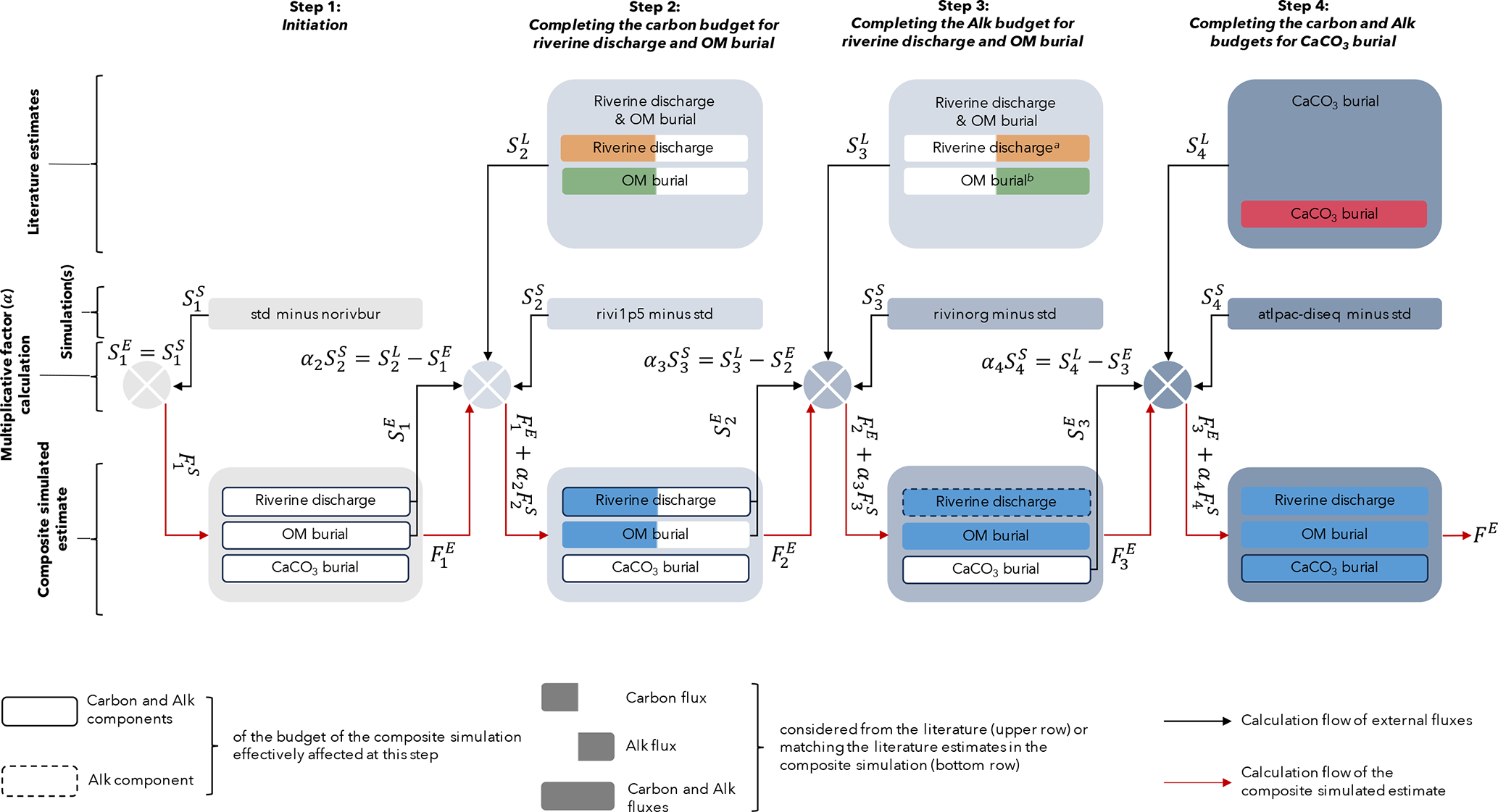Figure E2Schematic of the four-step workflow to construct the composite simulation. The composite simulated estimate of the riverine/burial-driven air–sea carbon flux is built from a linear combination of our sensitivity simulations to match the most recent carbon and Alk budgets (riverine discharge, OM burial, and CaCO3 burial). An additional step, equivalent to Step 3 but not shown in this general workflow, was necessary to adjust the CaCO3 burial of carbon in excess (Regnier et al., 2022), compared to the values accounted for Alk (Middelburg et al., 2020). In the schematic, the exponents indicate the source of each variable/parameter: E denotes the composite simulated estimate, S refers to the various sensitivity simulations, and L stands for literature estimates.