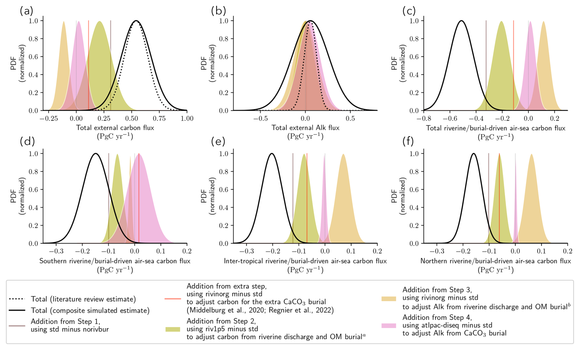 Figure E3Components of the composite simulated estimate (supplement to Fig. 7). Each of the components represents the elements added at the different stages of the composite simulated estimate construction process (Steps 1, 2, 3, 4, and the extra step; Fig. E2). (a, b) Decomposition of the composite simulated estimate PDF associated with the total (a) carbon and (b) Alk external fluxes. (c, d, e, f) Characterization of the riverine/burial air–sea carbon flux in the composite simulated estimate, showing the various components for (c) the total value, as well as the (d) southern, (e) inter-tropical, and (f) northern regions. The black solid lines represent the total values for the composite simulated estimate, while the black dotted lines (a, b) correspond to the total carbon and Alk external fluxes from literature estimates (Fig. E1).