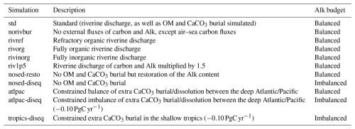 First, we introduced variations in riverine discharge to account for uncertainties in its magnitude and partly unresolved characteristics (e.g. labile/refractory, organic/inorganic partitioning). By closing the Alk budget, these variations influenced CaCO3 burial. In “rivref”, the OM riverine discharge was considered fully refractory (i.e. persisting on a timescale longer than that of ocean circulation), in contrast to the labile assumption in the standard simulation. We explored fully organic and inorganic riverine discharges in “rivorg” and “rivinorg”, respectively, and also increased riverine discharge by a factor of 1.5 in “riv1p5”, while maintaining the same partitioning as std. Second, to assess the effect of a non-conserved Alk inventory or an Alk restoration scheme, we disabled OM and CaCO3 burial, artificially restoring Alk in “nobur-resto” or assuming a non-conserved Alk inventory in “nobur-diseq”. Third, we varied CaCO3 burial to address uncertainties in its pre-industrial magnitude and spatial distribution. We added CaCO3 burial/dissolution between the Atlantic and Pacific, balancing the Alk budget in “atlpac”, or not in “atlpac-diseq”, and we also added CaCO3 burial in the tropics, resulting in an imbalanced Alk budget in “tropics-diseq”.