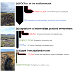 Depending on the extent of bare peat within a peatland, and the local slope and wind conditions, erosion can be the dominant pathway for carbon loss (Evans et al., 2006). Peat that is lost through erosion has potential to be degraded to CO2 at various stages on its transit as POC. Due to the complex biophysical processes and interactions that cascade from peat erosion there is very high uncertainty around the emissions that occur as a result. There is a risk of both under- and overestimating emissions from peat erosion, depending on the characteristics of the site. These uncertainties feed through to uncertainties in national peatland emissions reporting (IPCC, 2014) and estimates of emissions reductions that can be achieved through bare peat restoration and revegetation. There are mismatches in data on sediment/carbon fluxes at certain points and across scales on the journey of peat after it is eroded. These mismatches can be addressed by applying scalable measurements at key junctures in the peat sediment's transition out of the peatland. These measurements should be biologically and biogeochemically focussed on the processes that mineralise peat sediment to CO2, and ultimately cause the emissions that we need to quantify. Climate change is driving increasingly severe erosive forces across all peatlands, from increased storminess to decreasing permafrost stability. Therefore, emissions arising from peat erosion are likely to have an increasingly important role in the carbon balance of all peatlands.