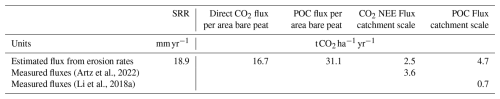 Table 1Measured Surface retreat rate (SRR) and estimated direct CO2 and POC losses from bare peat. Catchment scale net ecosystem exchange (NEE) of CO2 and POC losses for an eroding bog based on an assumption of 15 % bare peat cover compared to measured CO2 NEE (measured by Eddy Covariance, Artz et al., 2022) and POC losses (measured by sediment loss, Li et al., 2018a) at catchment scales.