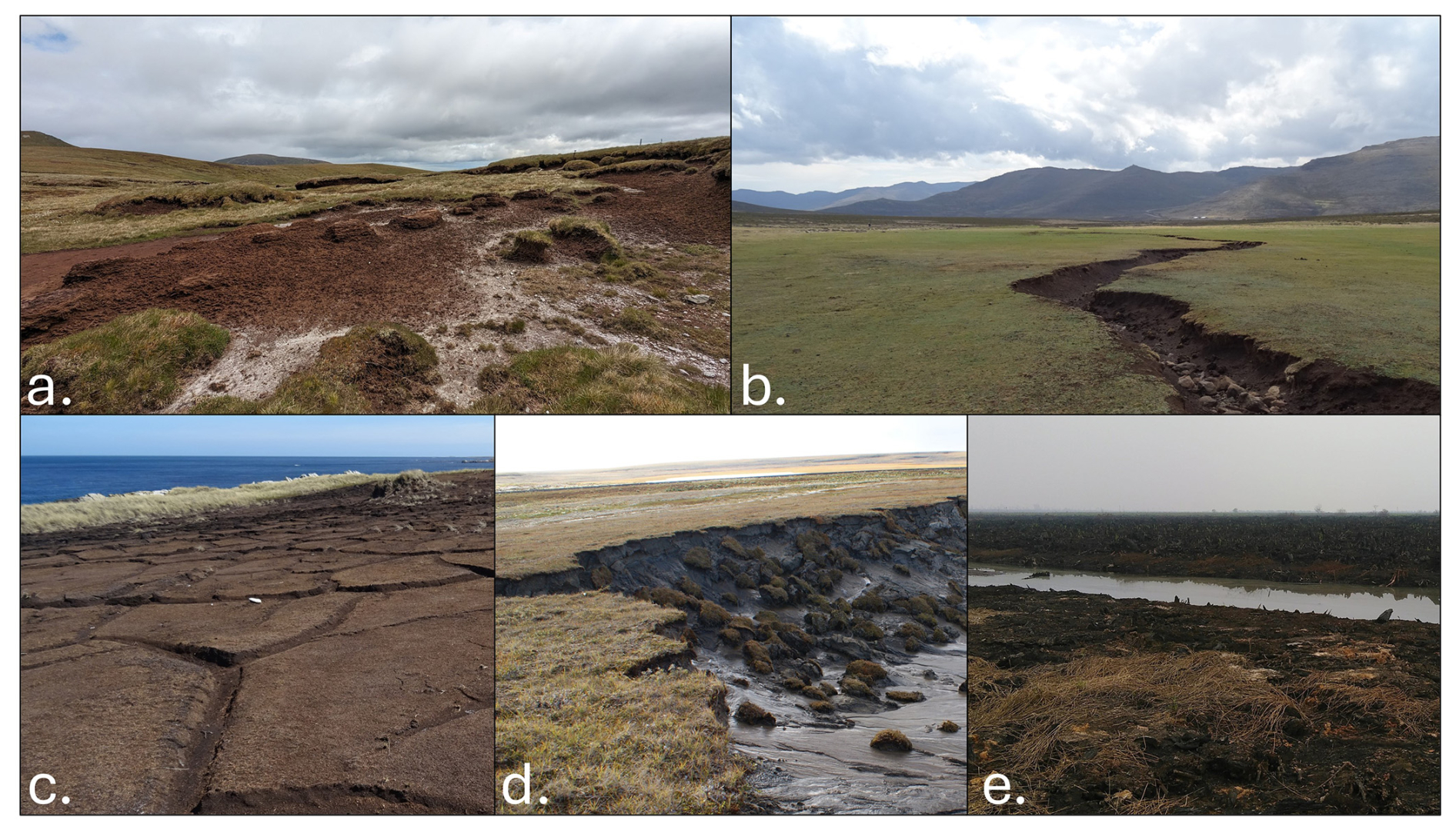 Figure 1Bare peat in (a) Scotland (Photo Thomas Parker), (b) Lesotho (Photo C. Evans), (c) Falkland Islands (Photo Chris Evans), (d) Siberia (© ESA; Photo Annett Bartsch) and (e) Indonesia (Photo Stuart Smith).