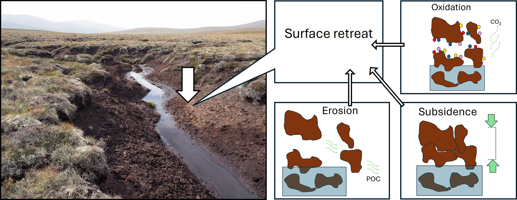 Mapping of bare peat extent at high resolution is progressing (Macfarlane et al., 2024) but the underpinning data for estimating emissions associated with bare peat are highly uncertain (Evans et al., 2013) as the flux depends on specific fluvial mixing events in time and space (Palmer et al., 2016). We argue that this calculation has two major sources of uncertainty which are critical to resolve to confidently quantify emissions that arise from peat erosion. Firstly, the flux of POC from bare peat at the source is only one part of peat volume loss – quantification of the relative contribution of direct CO2 loss, subsidence and erosion to surface retreat rates will give rise to better quantification POC loss via erosion. Eroded peat will potentially be processed and mineralised in multiple environments, from headwater streams, floodplains to rivers and the ocean (Evans et al., 2013; Zhou et al., 2021). Therefore, the second source of uncertainty is the fraction of eroded peat/POC that is converted to CO2. This can be addressed by considering the environments and organisms that interact with it while in transit over various timescales.