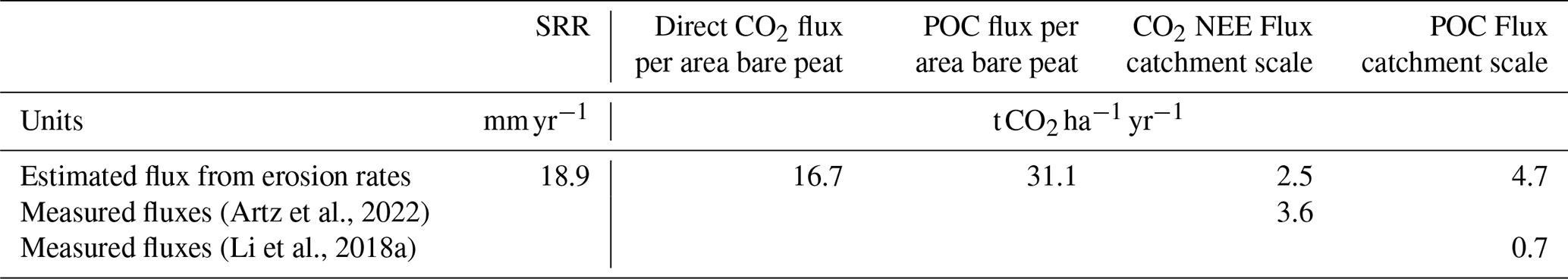 Table 1Measured Surface retreat rate (SRR) and estimated direct CO2 and POC losses from bare peat. Catchment scale net ecosystem exchange (NEE) of CO2 and POC losses for an eroding bog based on an assumption of 15 % bare peat cover compared to measured CO2 NEE (measured by Eddy Covariance, Artz et al., 2022) and POC losses (measured by sediment loss, Li et al., 2018a) at catchment scales.