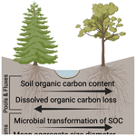 Finally, differences in the chemical composition of aspen and conifer biomass and their root exudates may explain differences in MAOC stocks between the two stand types (Boča et al., 2020). For example, aspen litter tends to exhibit lower lignin concentrations than coniferous litterfall (Moore et al., 2006). The Microbial Efficiency – Matrix Stabilization (MEMS) framework (Cotrufo et al., 2013) would suggest this more labile plant material may be easier for soil microbes to assimilate and transform into microbial necromass, which can become more physically or chemically protected through aggregation and chemical bonding (Kleber et al., 2007; von Lützow et al., 2008; Cotrufo et al., 2013) and lead to relatively more persistent stocks of SOC (Liang et al., 2019; Buckeridge et al., 2022). Differences in microbial activities between aspen and conifer may further be exacerbated by differences in root exudation between these species. For example, Norway spruce can exhibit lower exudation rates than silver birch (Sadnes et al., 2005), and deciduous trees appear to experience greater exudation rates than pines (Wang et al., 2021). Though many studies explore the biotic, chemical, physical, and hydrologic processes that can influence SOC transformations and preservation, these processes are rarely examined at the same time. Thus, it remains unclear why conifer-dominated forests consistently harbor smaller amounts of SOC, and why aspen-dominated forests exhibit greater SOC stabilization.