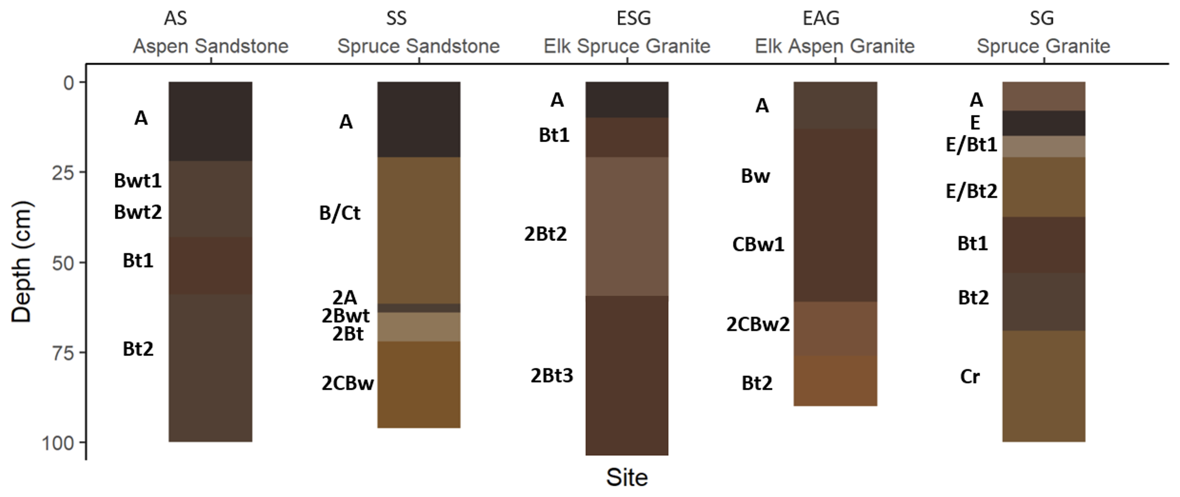 Spruce, aspen, and alpine meadows can be found in the Coal Creek watershed. North-facing slopes are dominated by Engelmann spruce, while aspen and Engelmann spruce can be found on south-facing slopes. We focused on five sites during this study. Three of our sites lie within the main drainage of Coal Creek, including two spruce sites (spruce sandstone, SS; spruce granite, SG) and one aspen (aspen sandstone (AS). The last two sites are located in Elk Creek, a sub-catchment of Coal Creek, which includes one spruce site and one aspen site, both underlain by granite (Elk spruce granite, ESG, and Elk aspen granite, EAG). While ESG is on a dominantly south-facing slope, it is north facing within the Elk Creek catchment.