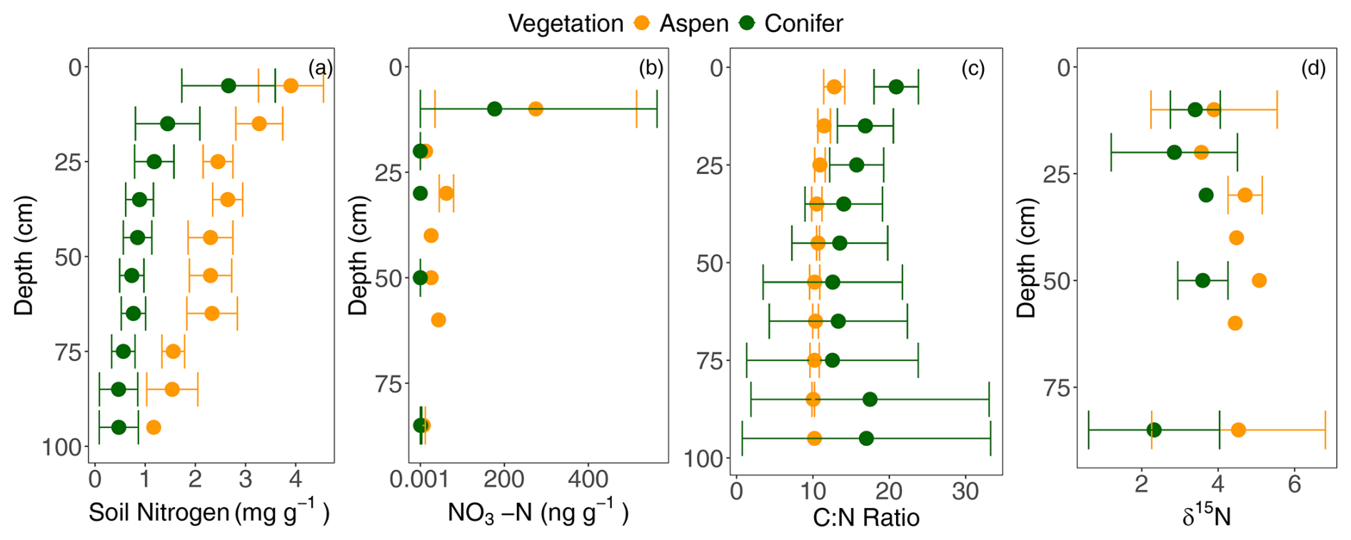Figure 5(a) Soil nitrogen, (b) soil nitrate, (c) carbon to nitrogen ratio (C:N), and (d) δ15N with depth under two different vegetation types, aspen (orange) and spruce (green), at the Coal Creek catchment, Colorado, USA. Values represent mean ± standard deviation. For each mean and standard deviation, where error bars are not visible the deviation is smaller than the point.