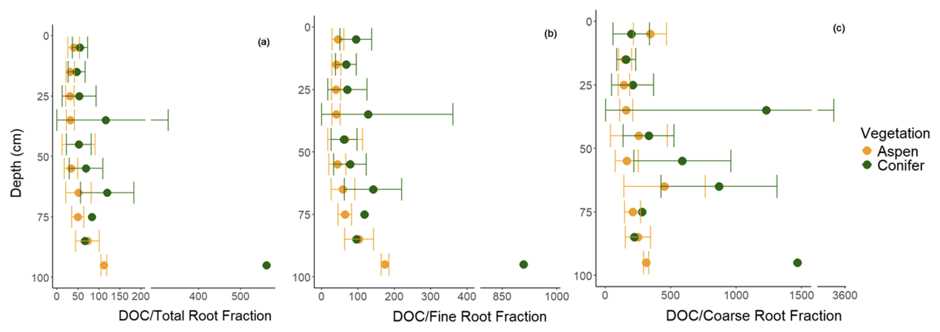 Figure 7DOC divided by mean (a) total, (b) fine, and (c) coarse root fractions every 10 cm under two different vegetation types, aspen (orange) and spruce (green), at the Coal Creek catchment, Colorado, USA. Values represent mean (points) ± standard deviation (bars). Root fractions represent the count of fine (< 1 mm) or coarse ( 1 mm) roots in 10 cm depth increments.