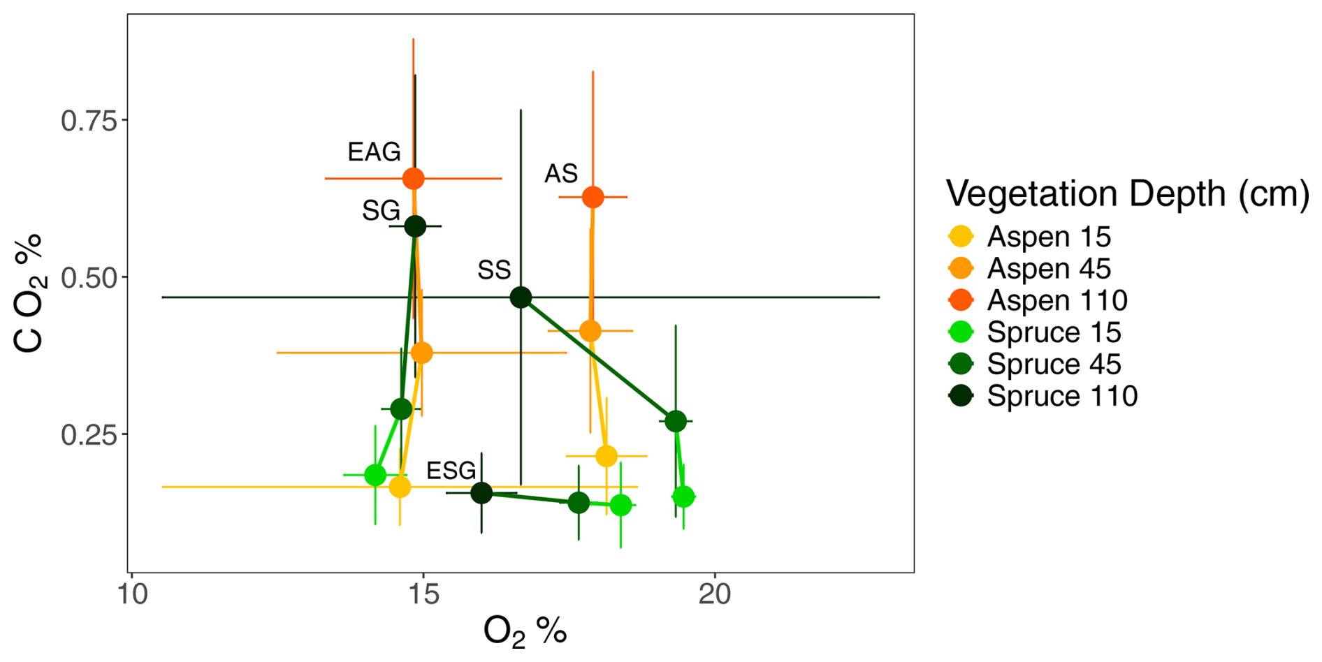 Figure 9Soil gas concentrations of O2 (%) and CO2 (%) at aspen (orange) and spruce (green) sites during the growing season at depths 15 cm (light), 45 cm (medium), and 110 cm (dark) at the Coal Creek catchment, Colorado. Values represent mean (points) ± standard deviation (bars) with lines connecting depths within each profile. The shallowest depth of each site is labeled: AS, aspen sandstone; EAG, Elk aspen granite; ESG, Elk spruce granite; SG, spruce granite; SS, spruce sandstone.