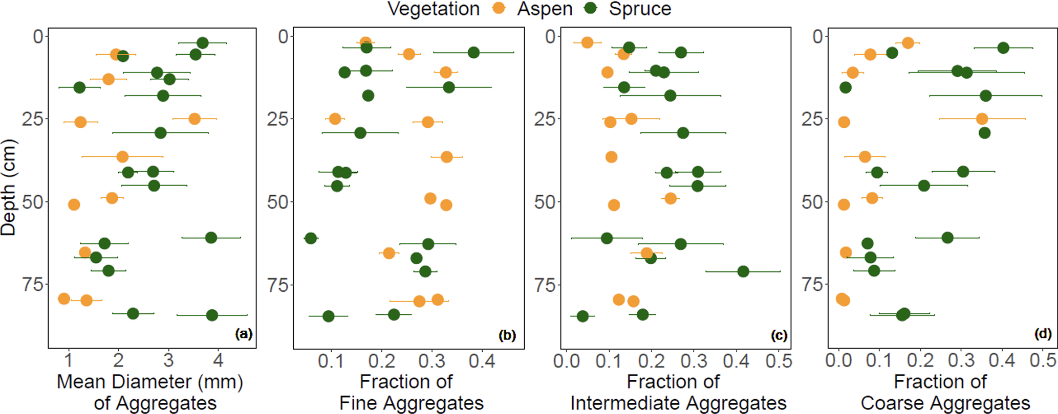 Figure 10(a) Diameter of soil aggregates, and fraction of (b) fine aggregates (< 0.21 mm), (c) intermediate aggregates (0.21–4.76 mm), and (d) coarse aggregates (> 4.76 mm) that contribute to the overall soil aggregate diameter at the Coal Creek catchment, Colorado, USA. Values represent (a) geometric mean or (b–d) mean (points) ± standard deviation (bars). Colors are associated with vegetation: aspen (orange) and spruce (green).