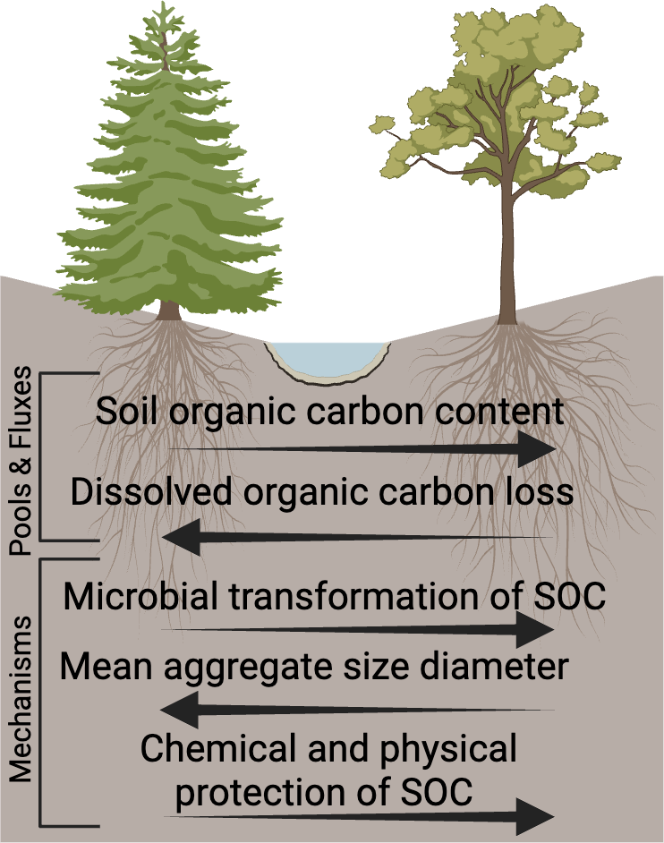 Finally, differences in the chemical composition of aspen and conifer biomass and their root exudates may explain differences in MAOC stocks between the two stand types (Boča et al., 2020). For example, aspen litter tends to exhibit lower lignin concentrations than coniferous litterfall (Moore et al., 2006). The Microbial Efficiency – Matrix Stabilization (MEMS) framework (Cotrufo et al., 2013) would suggest this more labile plant material may be easier for soil microbes to assimilate and transform into microbial necromass, which can become more physically or chemically protected through aggregation and chemical bonding (Kleber et al., 2007; von Lützow et al., 2008; Cotrufo et al., 2013) and lead to relatively more persistent stocks of SOC (Liang et al., 2019; Buckeridge et al., 2022). Differences in microbial activities between aspen and conifer may further be exacerbated by differences in root exudation between these species. For example, Norway spruce can exhibit lower exudation rates than silver birch (Sadnes et al., 2005), and deciduous trees appear to experience greater exudation rates than pines (Wang et al., 2021). Though many studies explore the biotic, chemical, physical, and hydrologic processes that can influence SOC transformations and preservation, these processes are rarely examined at the same time. Thus, it remains unclear why conifer-dominated forests consistently harbor smaller amounts of SOC, and why aspen-dominated forests exhibit greater SOC stabilization.