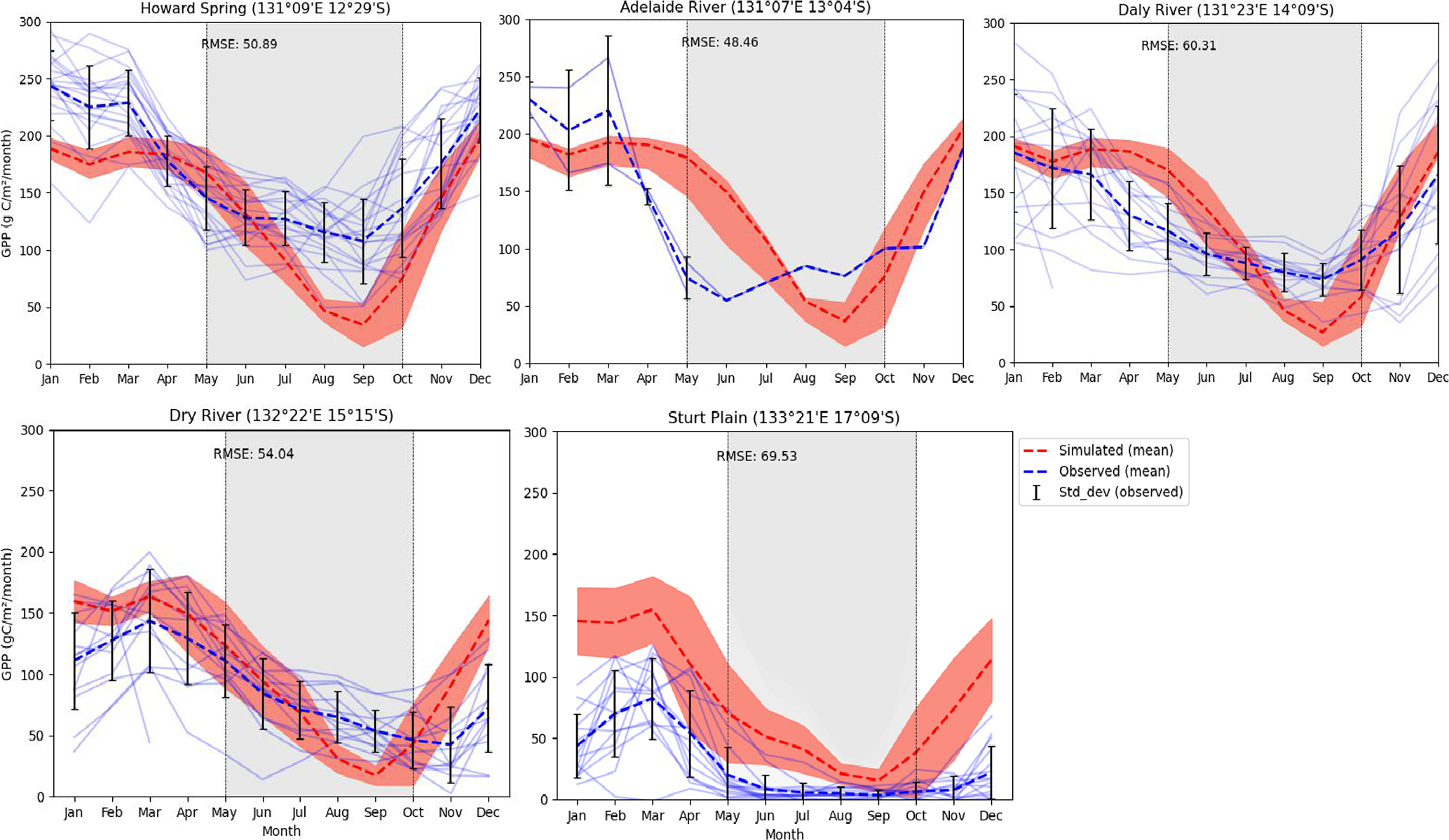 In this analysis, we compared observed monthly GPP data from different time frames; depending on the site, there is a decrease in productivity with a decrease in rainfall, showing a limitation of resources, especially water in dry regions. The monthly simulated and observed values (light blue lines) show, except for Sturt Plain, where the model overestimated GPP for all months (RMSE 69.53 g C m−2 month−1), that the model was able to capture productivity along the rainfall gradient (Fig. 3). Similarly, the model was able to capture both temporal and seasonal patterns with RMSE ranging from 48.46 to 69.53 g C m−2 month−1, but consistently underestimated productivity in the dry season in all sites except Sturt plain.