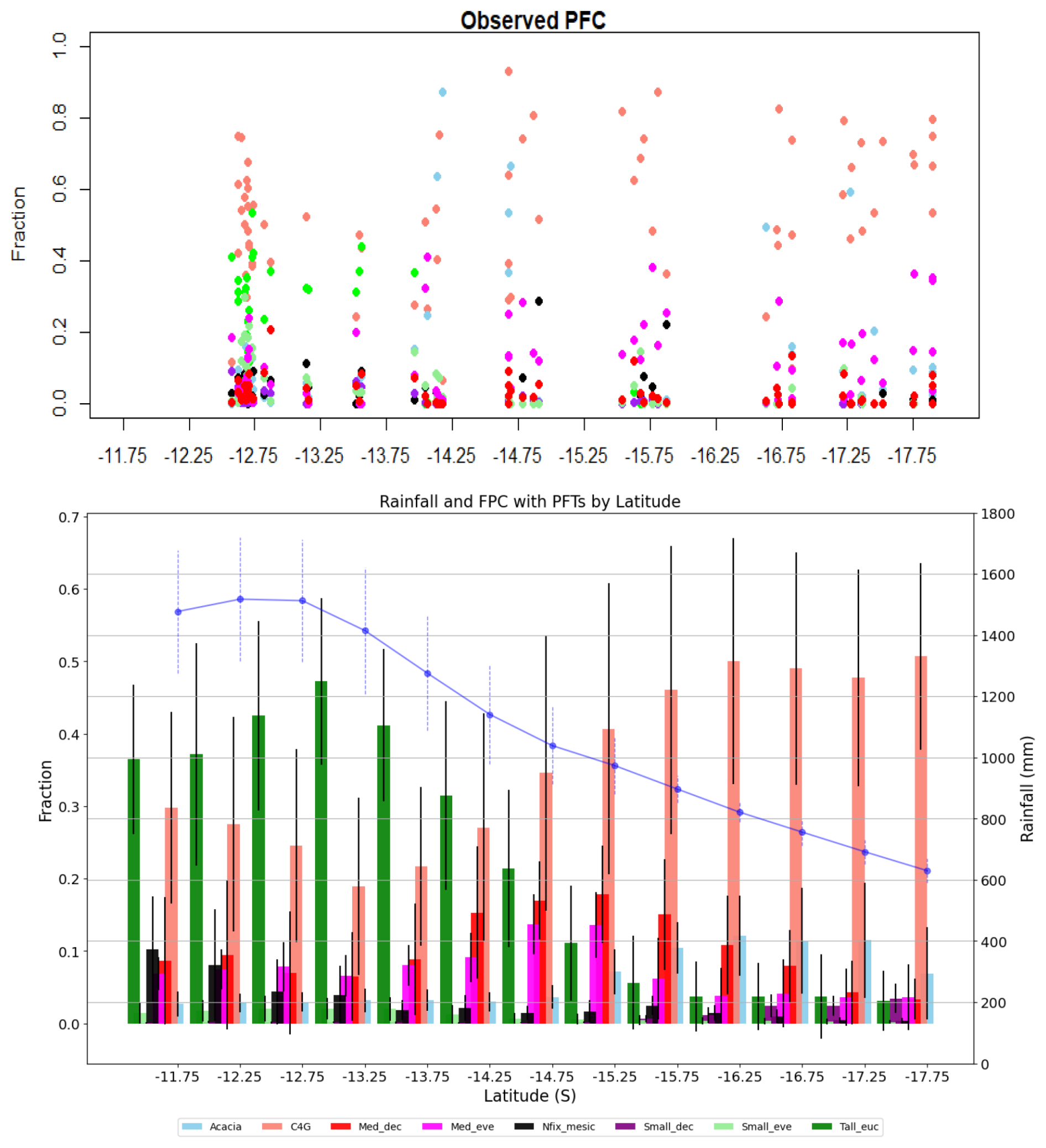 Figure 5Plot level projective foliar cover from ausplot (top panel) and simulated foliar projective cover by PFTs along the NATT (bottom panel). Bars represent mean value and error bar depicts standard deviation. Blue line shows mean rainfall with standard deviation (Acacia, C4G: grasses, Med_dec: Medium sized deciduous trees, Med_eve: medium sized evergreen trees, Nfix_mesic: Nitrogen fixing mesic trees, Small_dec: Small sized deciduous trees, Small_eve: Small sized evergreen trees, Tall_euc: tall eucalyptus trees).