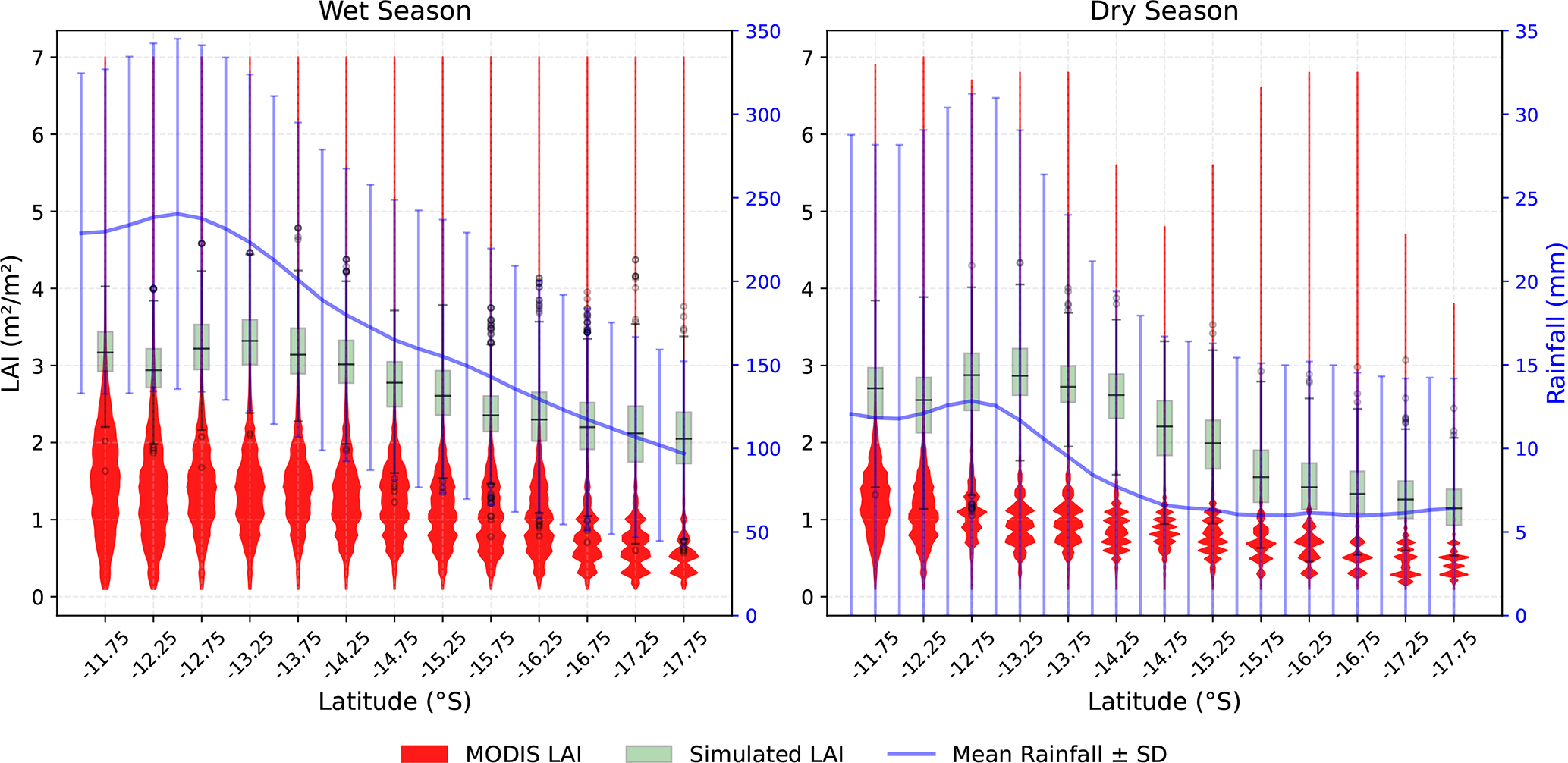 Figure 7 illustrates the seasonal variation in MODIS LAI and simulated monthly LAI values from 2000 to 2015 along NATT in relation to rainfall and seasons. Both LAI datasets exhibit the same pattern, i.e., a decrease in LAI with decreases in rainfall. The MODIS LAI shows more variability in LAI compared to the simulated LAI, where the simulated LAI was within the range of MODIS LAI (Fig. 7). Across the simulated longitude, MODIS LAI has a denser value within the range of 1 to 2 m2 m−2 in the wetter end of the gradient, with a maximum of 7 m2 m−2 in both seasons. In both LAI, at the wetter end of the gradient, LAI remains relatively constant throughout the year, whereas in the dry season, LAI at the dry end of the gradient is smaller (less than 2 m−2 m−2). It reflects that the PFTs' composition (Fig. 5) and their adaptive mechanisms vary with water availability, as rainfall in the wet season is significantly higher than in the dry season.