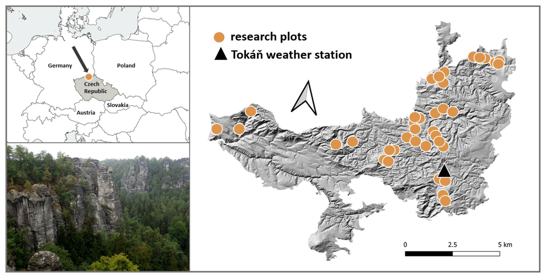 Figure 1We measured microclimate and simultaneously recorded bryophyte species composition at 38 permanent research plots within the Bohemian Switzerland National Park in Central Europe. This forested area has rugged terrain creating steep environmental gradients over short distances.