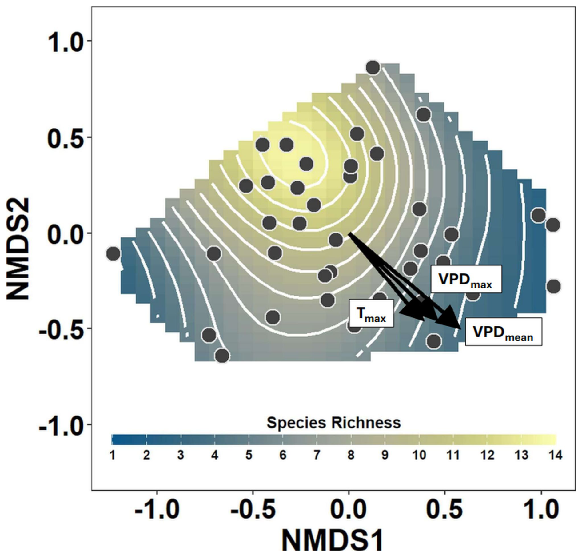 Figure 2Nonmetric multidimensional scaling (NMDS) of the bryophyte community composition showing main gradients in bryophyte assemblages sampled at 38 temperate forest plots. Points show the positions of the individual plots within the NMDS ordination space, and the vectors show the gradients in the maximum air temperature (Tmax), maximum VPD (VPDmax) and mean VPD (VPDmean). The smooth surface and associated contours fitted into the NMDS ordination space with a generalized additive model show the pattern of decreasing species richness with increasing evaporative stress.