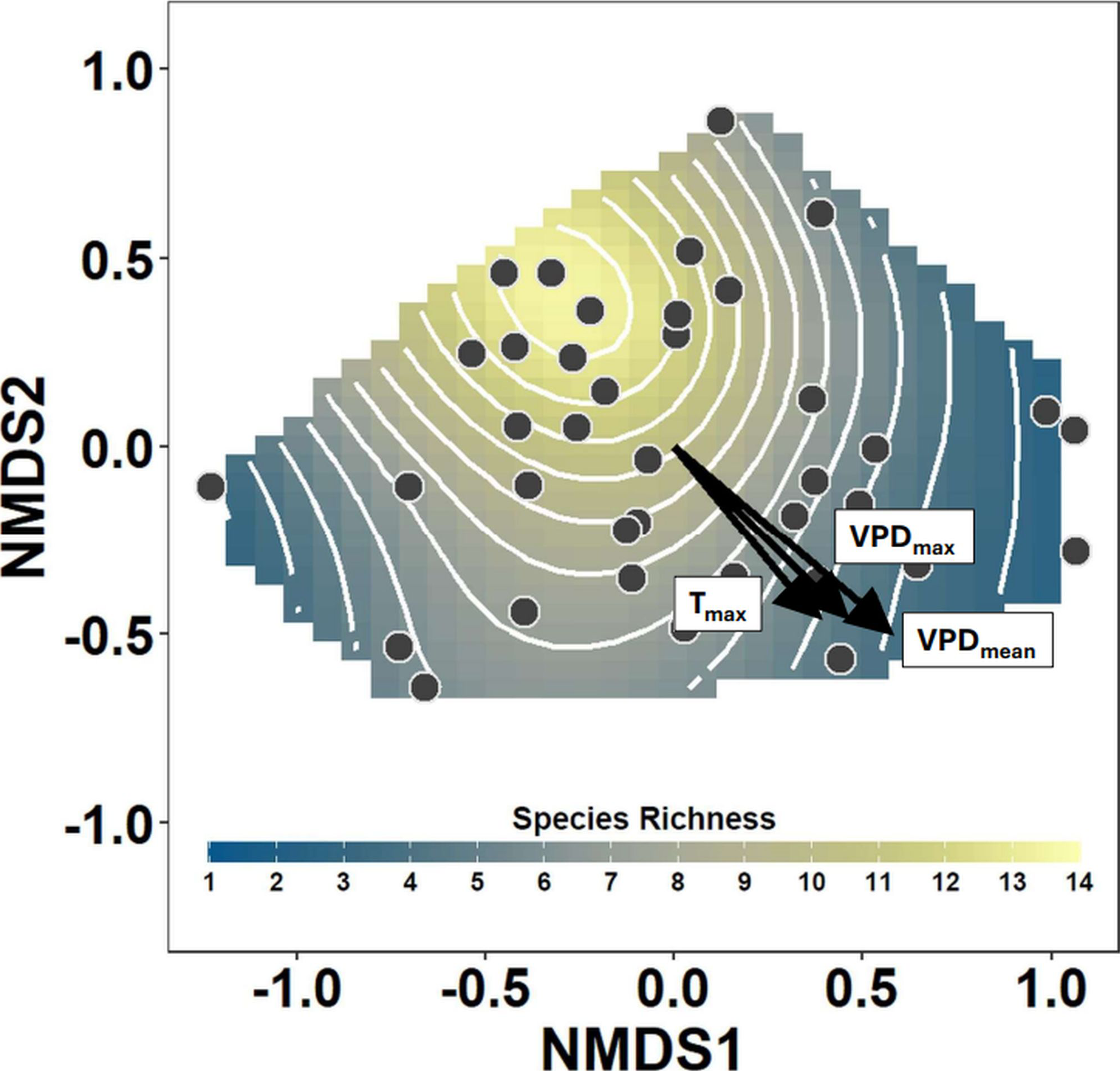Main patterns in community composition and species richness reflected the gradient of evaporative stress (Fig. 2). Gradient in Tmax was highly correlated to the gradients in VPD (Fig. 2), but main patterns in community composition were less related to Tmax than to VPD (vegan::envfit – Tmax: R2 = 0.32, p = 0.003; vegan::envfit − VPDmean: R2=0.52, p = 0.001; VPDmax: R2=0.37, p=0.001).