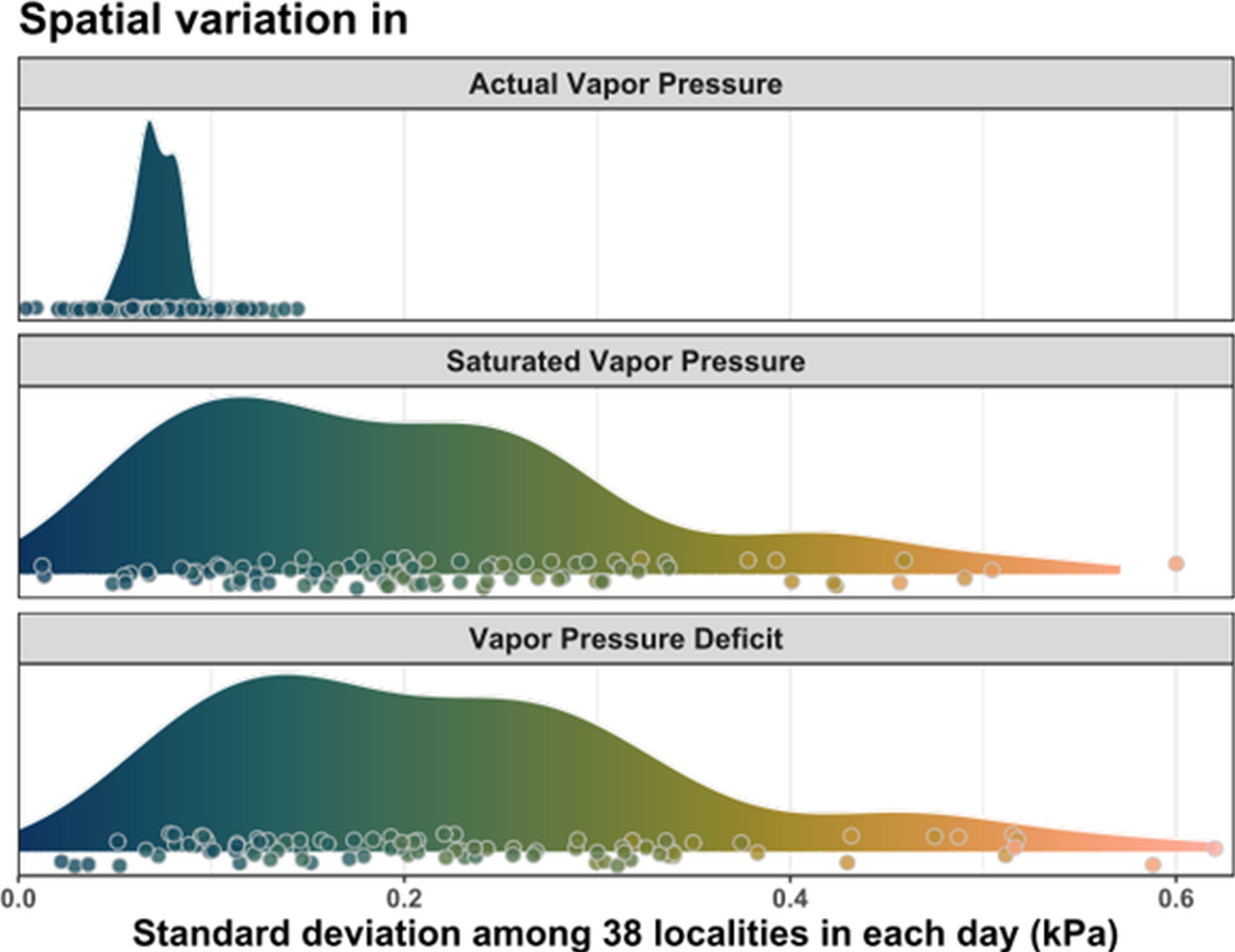 Using the time-series of both VPD components (Psat and Pair), we explored their spatio-temporal variability and quantify their influence on the VPD variability over the landscape. First, we explored how variable was VPD and both its components over the landscape in a daily timesteps. Then, we averaged this daily variability into the overall measure of spatial variability in VPD, Psat, and Pair during the whole study period. Finally, we used variation partitioning to quantify how much was VPD variability controlled by Psat and Pair.