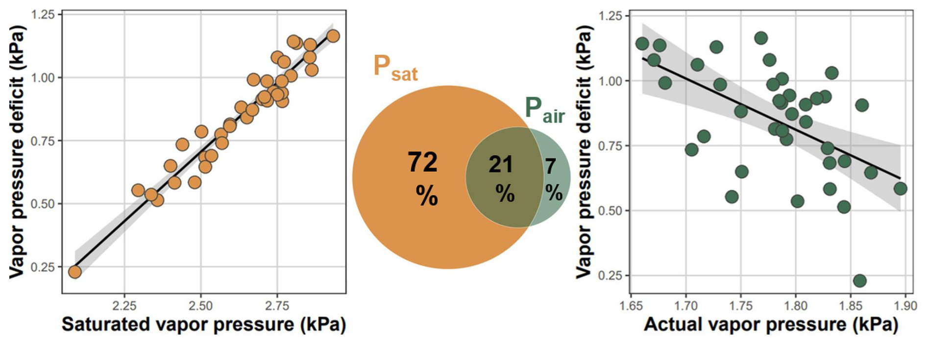 Figure 6Atmospheric vapor pressure deficit (VPD) was driven by temperature-dependent saturated vapor pressure, while actual vapor pressure was weakly related to local VPD. Each dot represents the mean VPD, and the mean saturated and actual vapor pressure measured during the summer at 38 forest plots established over topographically diverse landscape. Venn diagram shows variation (adjusted R2) in mean VPD explained solely by mean saturated (Psat) and mean actual (Pair) vapor pressure and the variation explained jointly by both predictors.