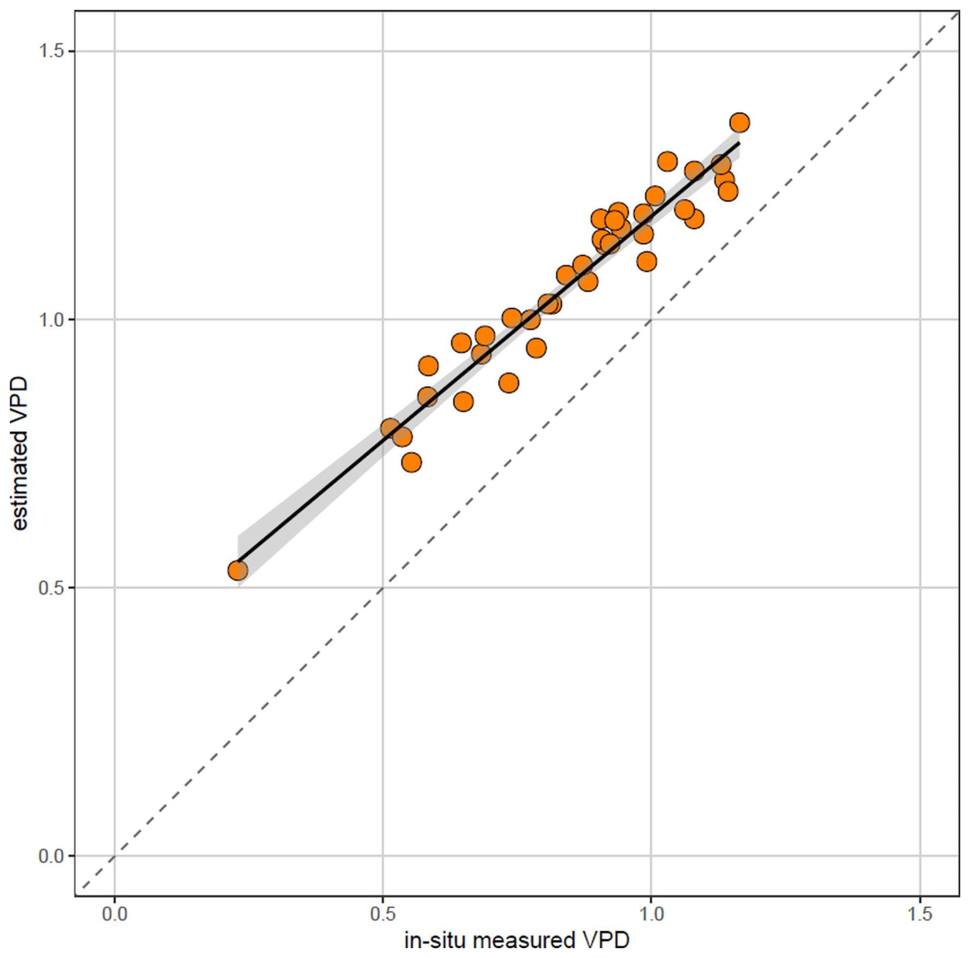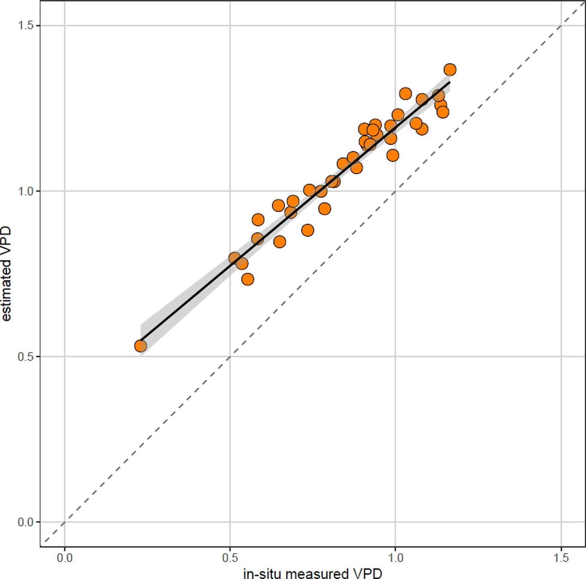 While the measured and estimated VPD were closely correlated (Pearson r = 0.97), estimated VPD were consistently higher than in-situ measured VPD (Fig. B1).