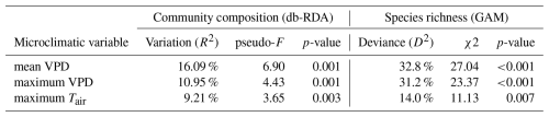 Table 2Variation in community composition and species richness explained by three microclimatic variables representing evaporative stress. To quantify variation explained by each variable, we used distance-based redundancy analysis (db-RDA) for community composition and generalized additive models (GAM) for species richness.