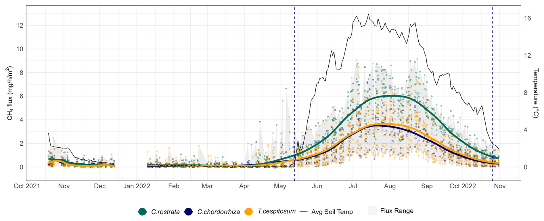 Figure 3Year-round methane fluxes (mg CH4 m−2 h−1) of Puukkosuo with average soil temperature at 5 cm depth. The gray flux range shows the overall variation of the fluxes. Smoothed conditional means (LOESS method) and data points, which represent individual plot-scale flux measurements, are segregated by vascular plant clusters defined in the text in Sect. 3.2. The vertical dashed lines mark the start and end of the snow-free season (13 May–26 October 2022).