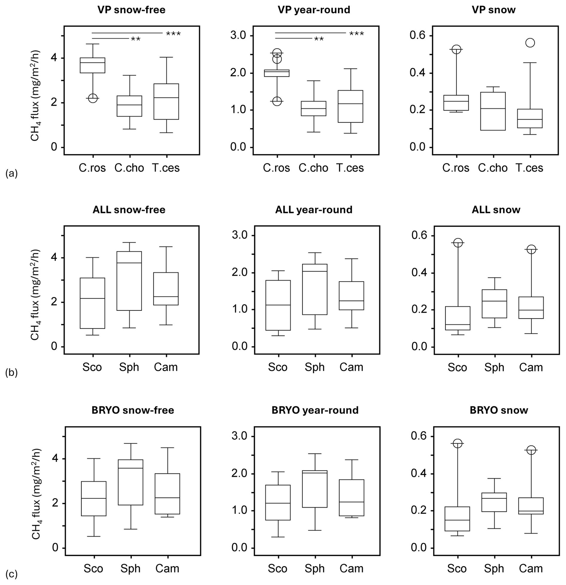 An analysis of variance (ANOVA) revealed that VP clusters significantly explained variation in methane fluxes during the snow-free (F=10.71, p<0.001) and year-round seasons (F=10.92, p<0.001) but not during the snow season (F=2.14, p>0.05). Tukey's HSD test indicated that the C. rostrata cluster, which had the highest fluxes, especially during the snow-free season (Fig. 3), differed significantly from the C. chordorrhiza and T. cespitosum clusters in the snow-free (p<0.01 and p<0.001, respectively) and year-round periods (p<0.01 and p<0.001, respectively) but not in the snow season (Fig. 4a). There were no significant differences between the C. chordorrhiza and T. cespitosum clusters in any of the periods (Fig. 4a–c). The cluster with all species considered did not significantly explain variation in methane fluxes in any period (F=1.51, p>0.2 for snow-free, F=1.45, p>0.2 for year-round, and F=0.57, p>0.5 for snow season, Fig. 4b). Similarly, bryophyte clusters did not show significant effects on methane fluxes (F=1.23, p>0.3 for snow-free, F=1.26, p>0.2 for year-round, and F=0.90, p>0.4 for snow season, Fig. 4c).