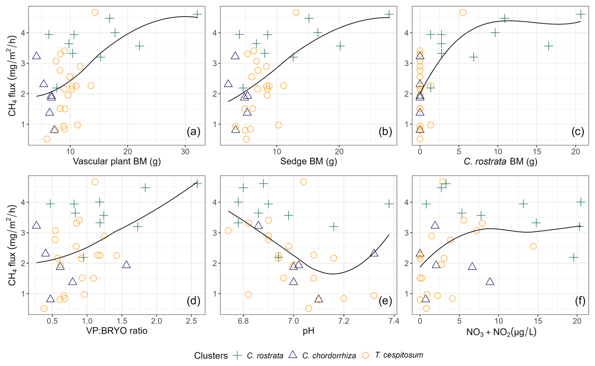 Figure 6Scatterplots showing the relationships between methane (CH4) flux (mg m−2 h−1) and environmental variables: (a) total biomass (BM) of vascular plants (p<0.001, r=0.54), (b) total BM of sedges (p<0.001, r=0.57), (c) BM of C. rostrata (p<0.001, r=0.60), (d) BM ratio of vascular plants and bryophytes (p<0.01, r=0.45), (e) pH (p<0.05, ), and (f) NO3 + NO2 concentration (p<0.05, r=0.34) across different vascular plant clusters. Vascular plant clusters are defined in the text in Sect. 3.2. The smoothing lines were fitted using local polynomial regression (LOESS) with a span value of 1 for moderate smoothing. Biomasses are in grams of dry weight.