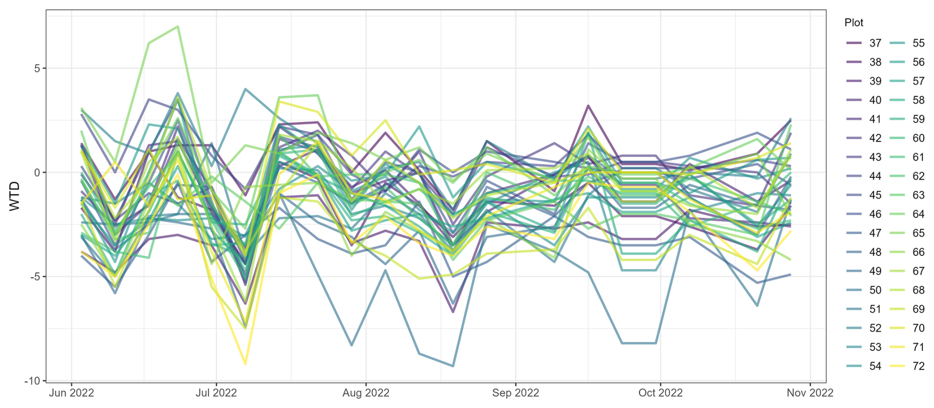 Figure A1The depth of the water table (WTD) at 36 study plots in Puukkosuo fen during June–October 2022. The average minimum value for WTD was −4.8 cm, and the average maximum was +1.8 cm from the peat surface.