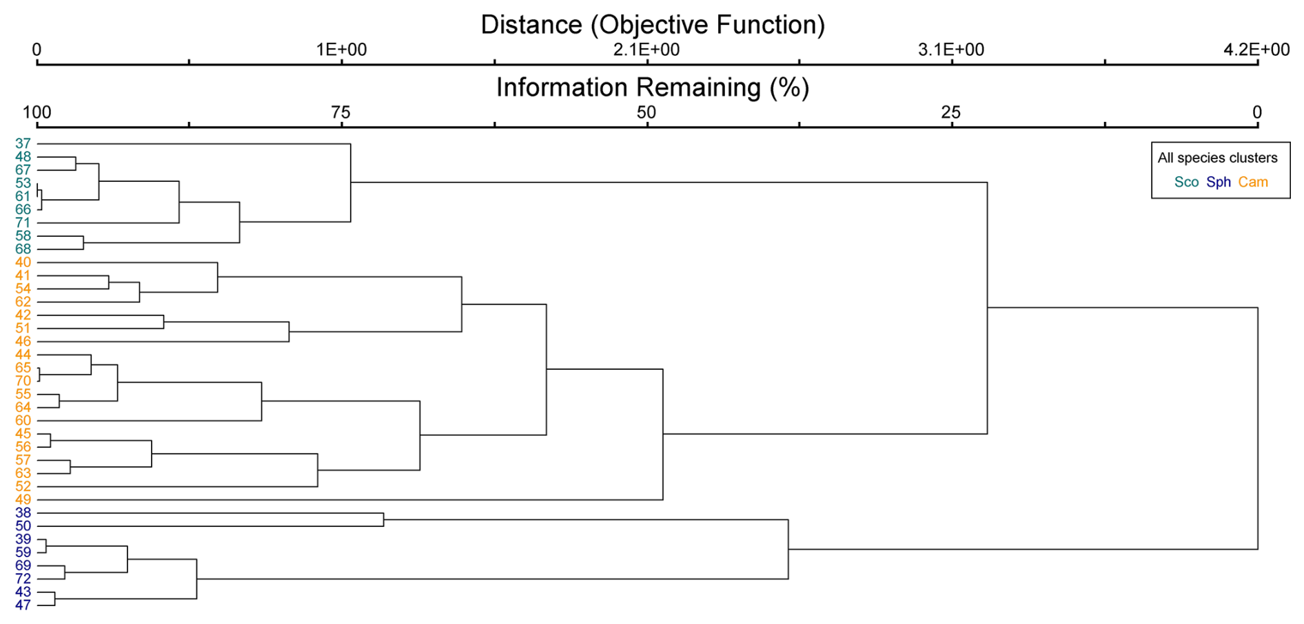 Figure B3Cluster dendrogram of bryophyte data. Indicator species by clusters: Sco = Scorpidium cossonii, Sph = Sphagnum spp. and Paludella squarrosa, and Cam = Campylium stellatum.