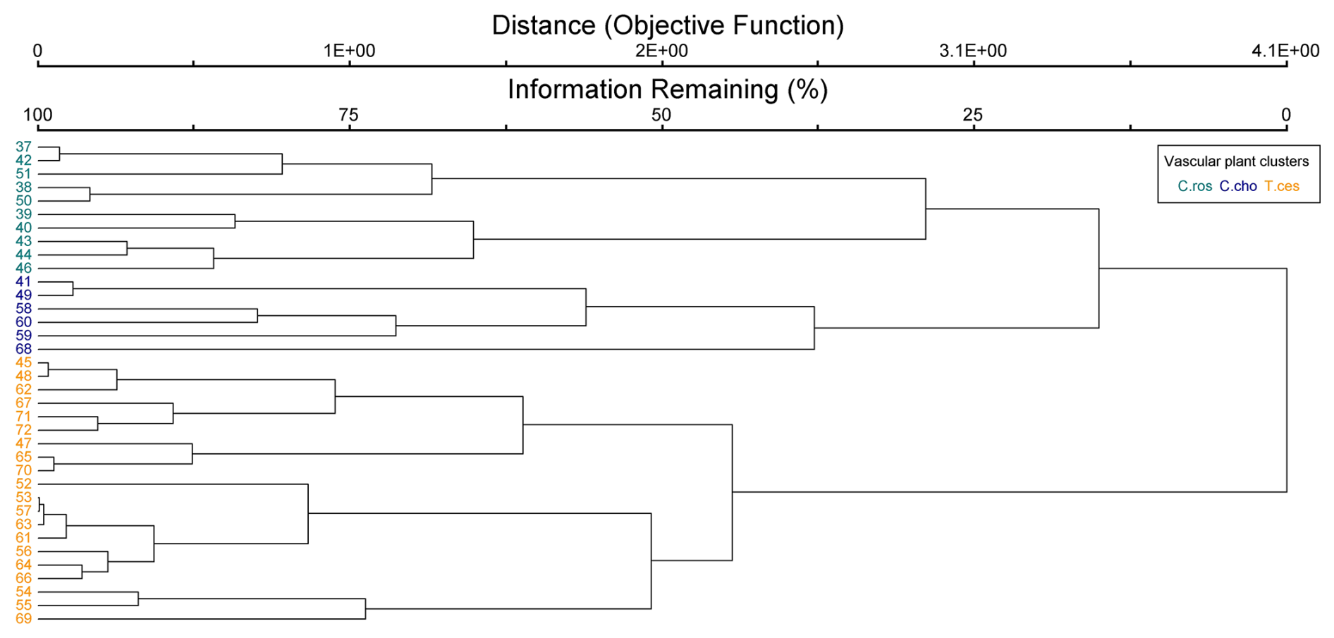 The cluster and indicator species analyses for all species, VPs, and bryophytes yielded three clusters (groups of plots), each with significant (p<0.05) indicator species statistically connected to the clusters (Figs. B1–B3). The cluster analyses indicated that bryophytes (Sphagnum spp., S. cossonii, and C. stellatum) showed the strongest connection to the clusters when analyses were conducted with all plant species or bryophytes (Figs. B1 and B3). On the other hand, when analyzing VPs alone, the clusters connected mostly with different sedges (C. rostrata with the first, C. chordorrhiza with the second, and Trichophorum cespitosum, C. lasiocarpa, and Potentilla erecta (a forb) with the third cluster). From here on, the clusters are referred to as the C. rostrata cluster, the C. chordorrhiza cluster, and the T. cespitosum cluster, respectively. The characteristics of each VP cluster, including their community structure and indicator species, were studied by comparing the indicator values of the species (Table B1). The results demonstrated that the plant communities differed between the clusters, as most species were abundant in only one or two clusters, and only three species (Campylium stellatum, Vaccinium oxycoccos, and Scorpidium cossonii) were common in all clusters (Table B1). The spatial division of the vascular plant communities was clear – the C. rostrata community plots were all located in the upper part of the sloping fen, while the other two clusters were more widely distributed (Fig. B6).