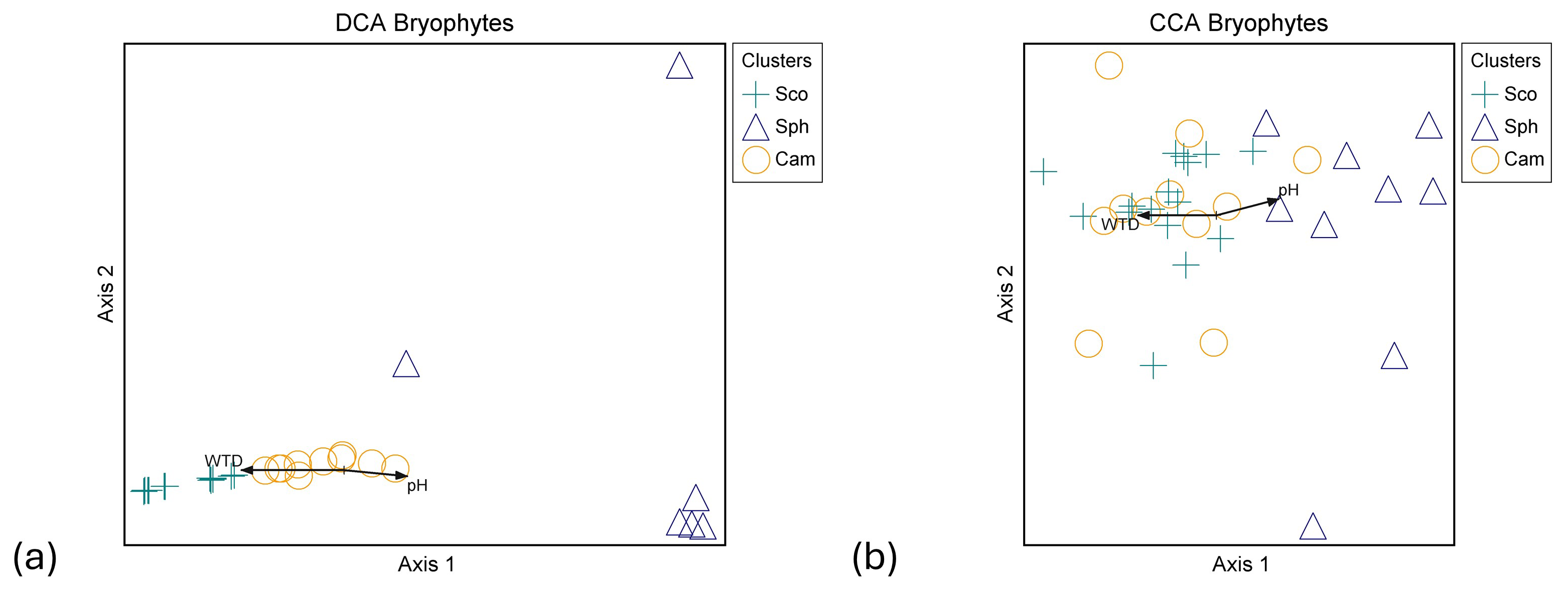 Figure B4Ordination graphs of bryophyte data. (a) DCA with rare species downweighted (eigenvalue axis 1 = 0.950, axis 2 = 0.364) and (b) CCA (eigenvalue axis 1 = 0.711, axis 2 = 0.510). Abbreviations for plant community clusters: Sco = Scorpidium cossonii, Sph = Sphagnum spp. and Paludella squarrosa, and Cam = Campylium stellatum. WTD stands for water table depth and CarRos for the biomass of C. rostrata.