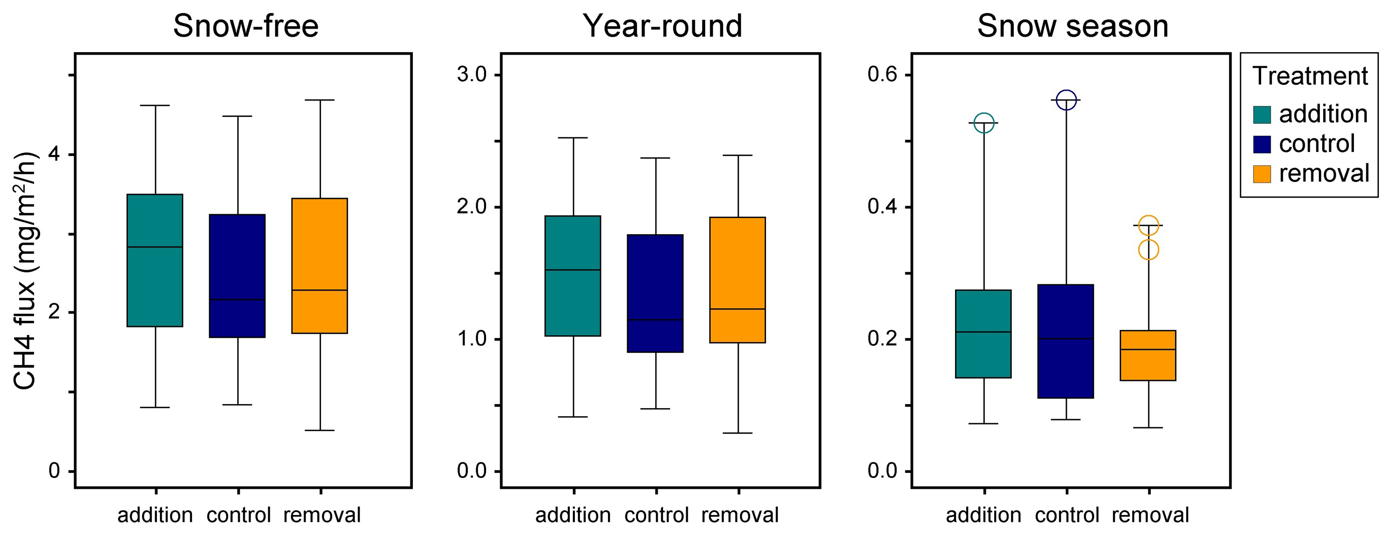Figure B5The relation of the snow level manipulation experiment's treatments and methane flux in different time periods. There were no significant (p<0.05) differences between the treatments in relation to the fluxes. Control plots represent the natural snow level, while in removal plots, the snow depth was maintained at 0.25 m by shoveling the snow and distributing it evenly onto the addition plots.