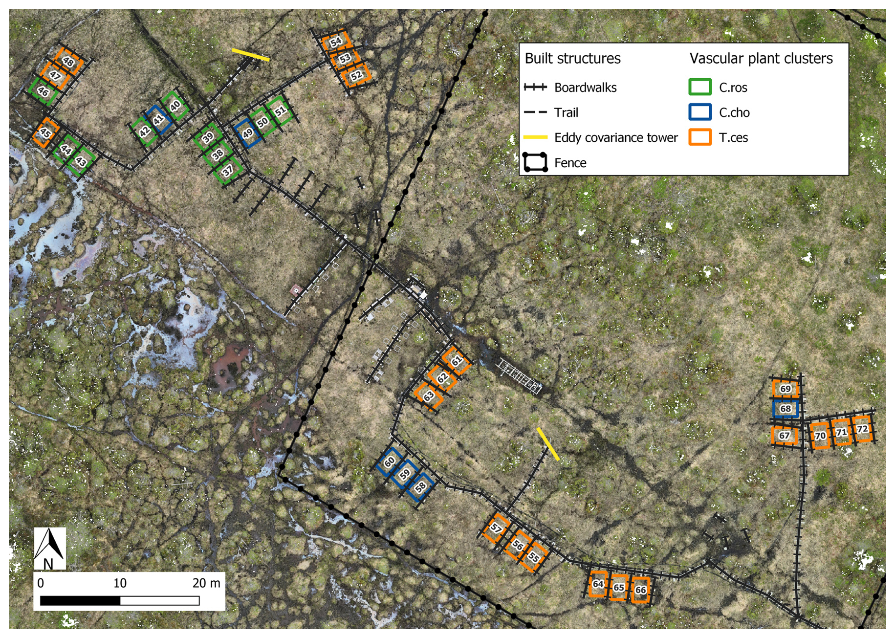 Figure B6Location of the study plots at Puukkosuo fen segregated by vascular plant clusters. Indicator species most strongly connected to the vascular plant clusters: C.ros = C. rostrata, C.cho = C. chordorrhiza, and T.ces = C. lasiocarpa, P. erecta, and T. cespitosum. Orthomosaic © Petra Korhonen 2024.
